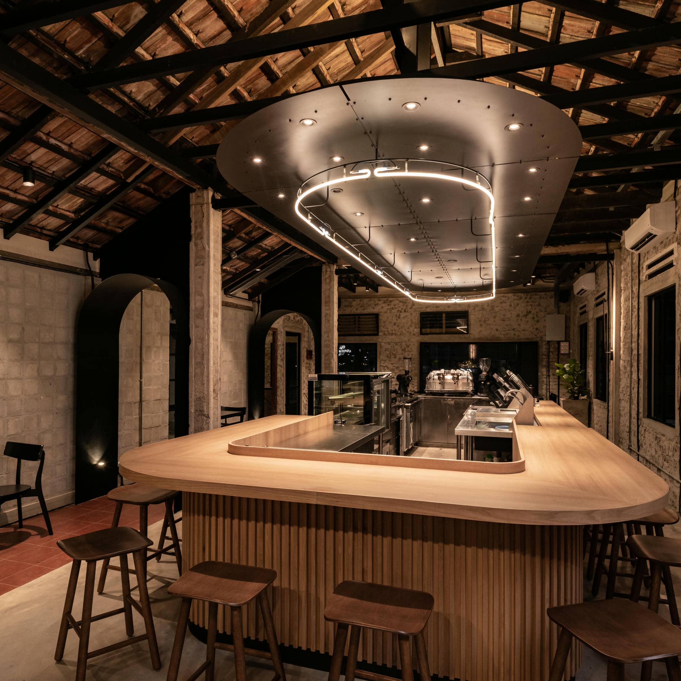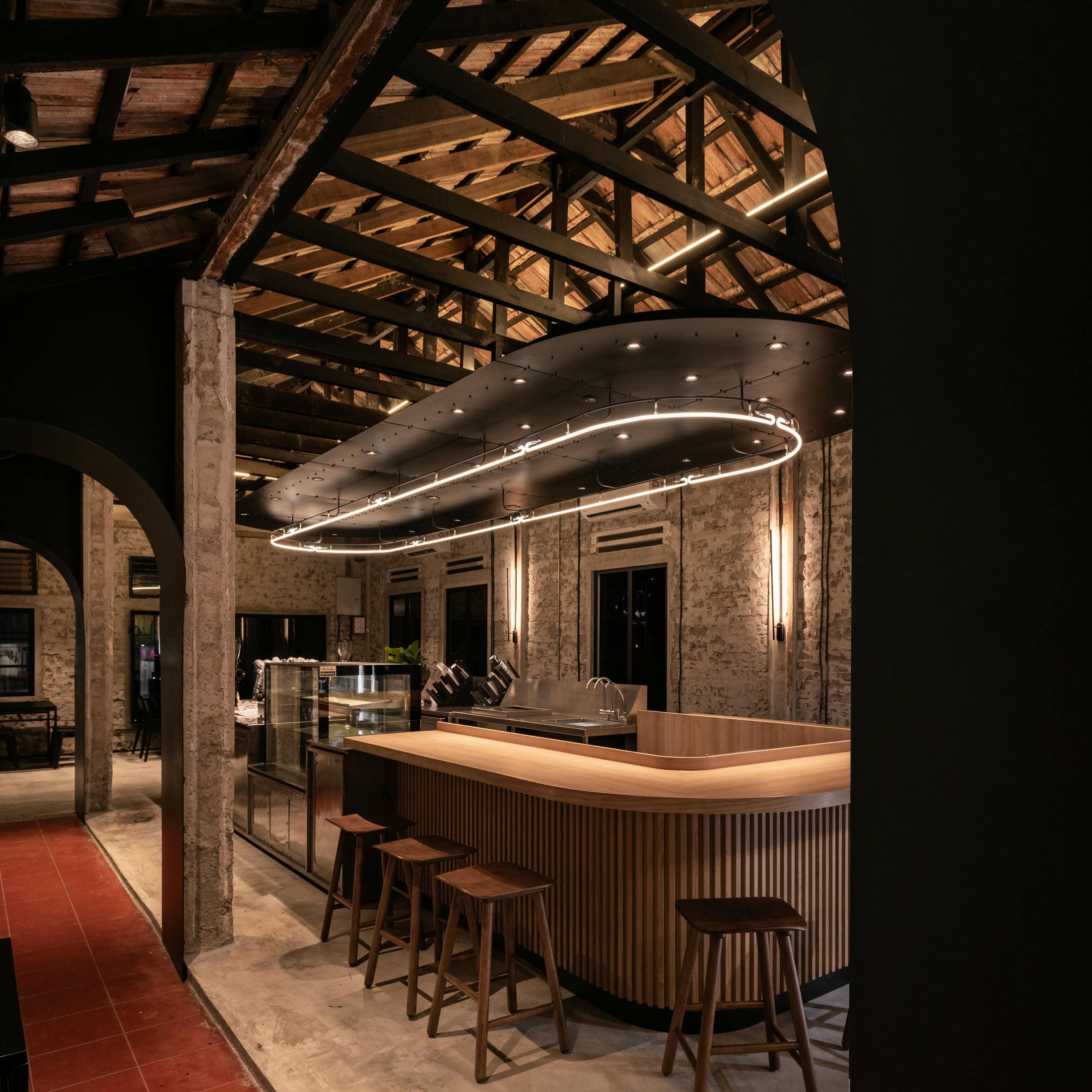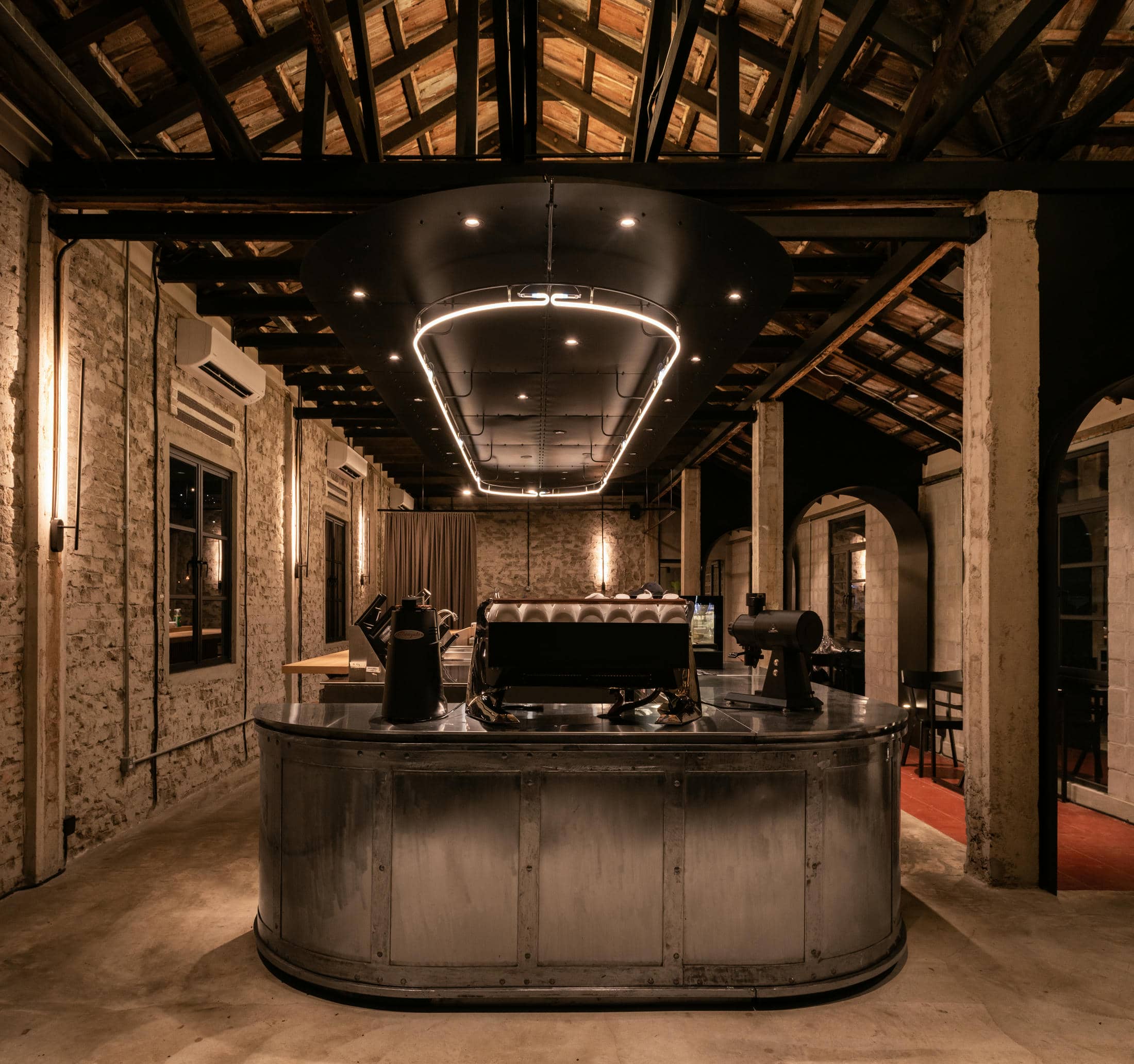 Frank Laurent X Lee Motors – Housed within a two-story detached building is this delicious café from Frank Laurent Coffee Roasters. Located underneath the flagship Frank Laurent coffee roasters storefront, this vibrant, simple, yet sleek gelateria is designed to quickly become the talk of the city in Alor Setar. Upstairs, the slick and silky blacks that make up the essence of Frank Laurent branding seep their way downstairs into this aromatic, open design café. With masculine design elements and industrial vibes throughout every inch of the Frank Laurent Coffee Roasters Café, we’ve created the perfect multifunction event space, complete with a full-service main kitchen in the back. This stunning example of history acts as the main first-floor entrance for the Frank Laurent coffee roasters. In addition, it features a grand, iconic staircase inviting visitors to follow the succulent aromas coming from above.