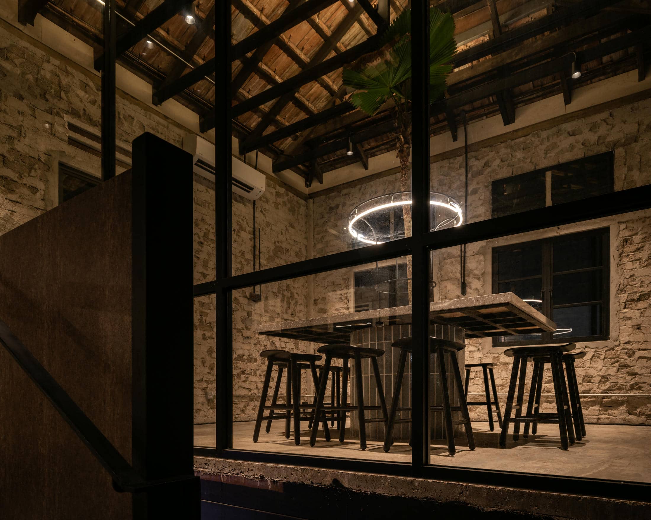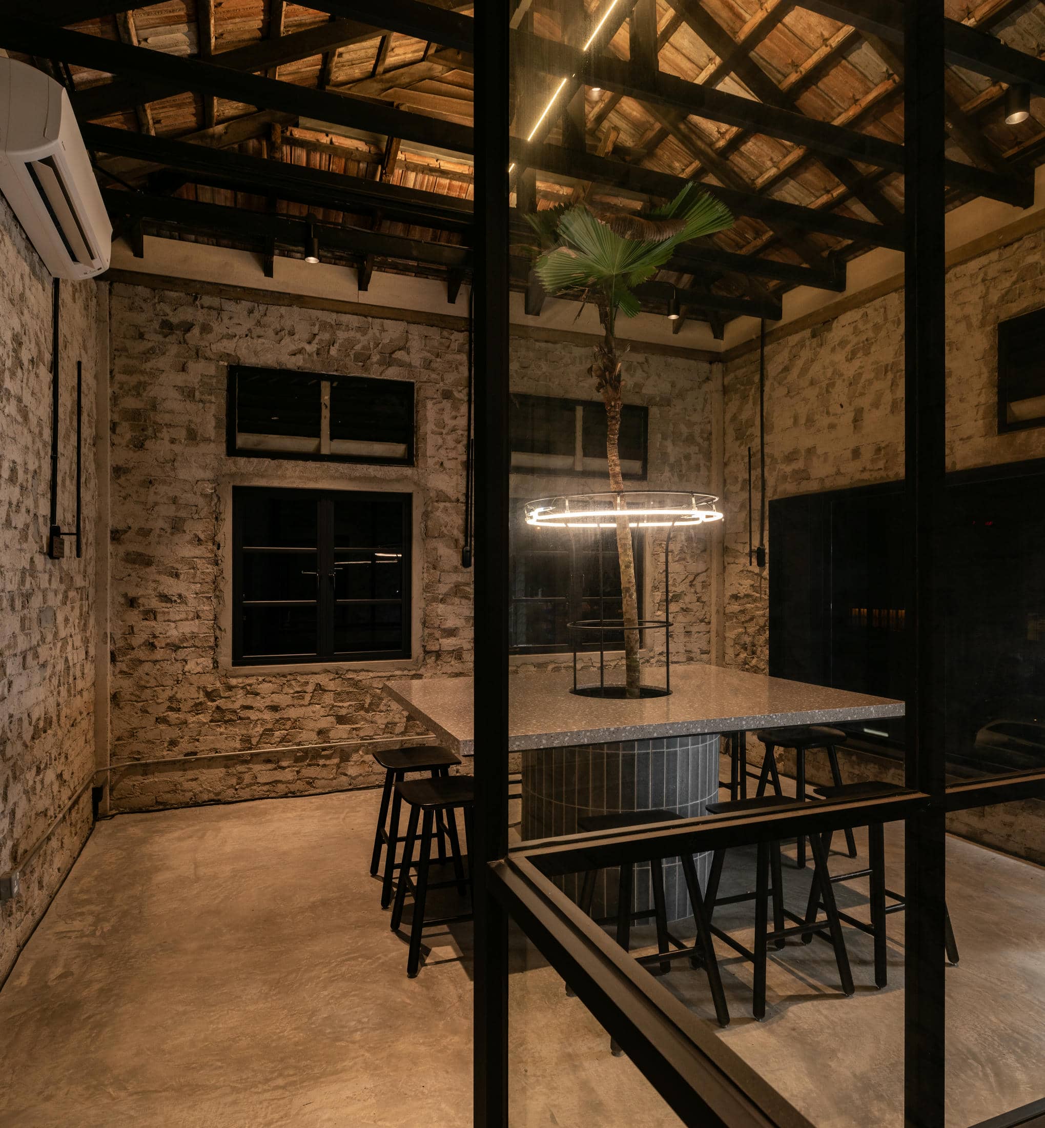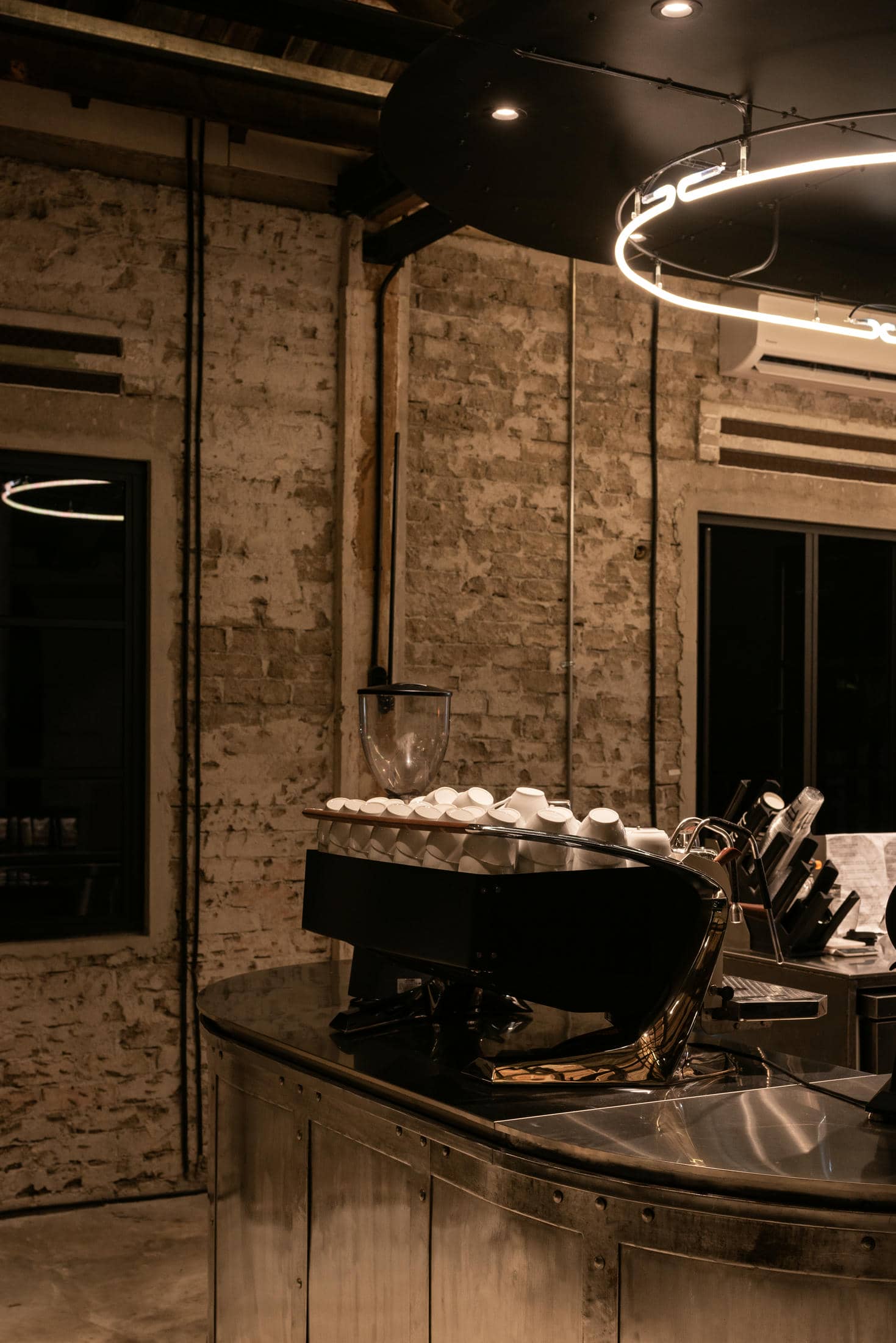 At the end of the counter with U-seating function as occasion omakase serving. The Frank Laurent Coffee Roasters Café is designed to be a place for the community, coffee lovers, and more to gather, talk, commiserate, and connect over the things they love. We added an extra touch of class and elegance by leaving all of the building trusses exposed. Then our interior designers strategically and artistically lit them better to showcase the original structure of this historic building. Whether customers want to host an event, listen to music, or find a new place to enjoy their favorite city, this inviting, sophisticatedly designed café is built to accommodate everyone. In addition, the black, bespoke design touches that customers love about the Frank Laurent Coffee Roasters above can be found throughout the downstairs parlor. From the black-colored metal plates and massive trusses to the custom-designed countertop and serving areas, elegance runs throughout this industrial warehouse / retro semblance with plenty of space.