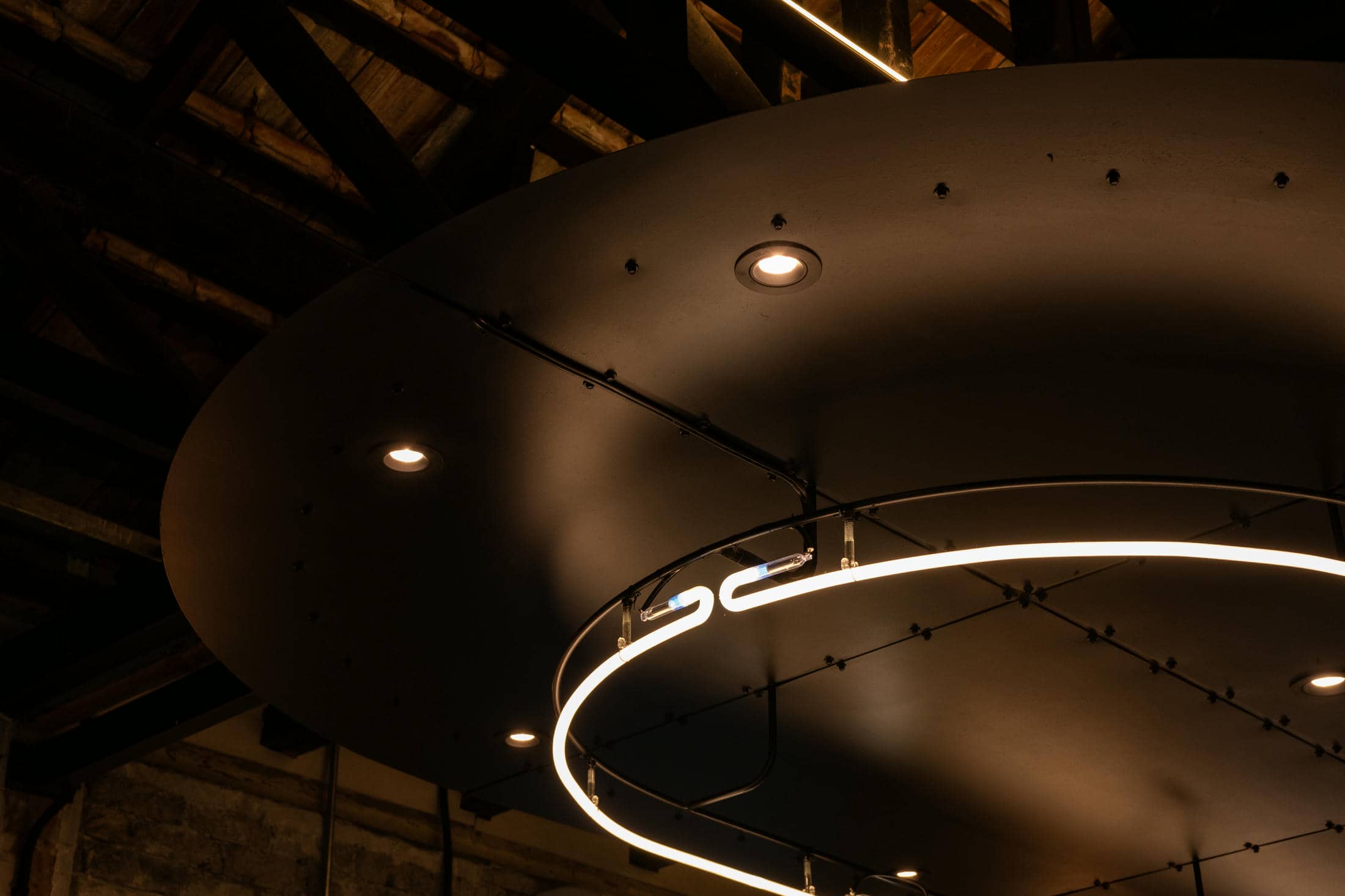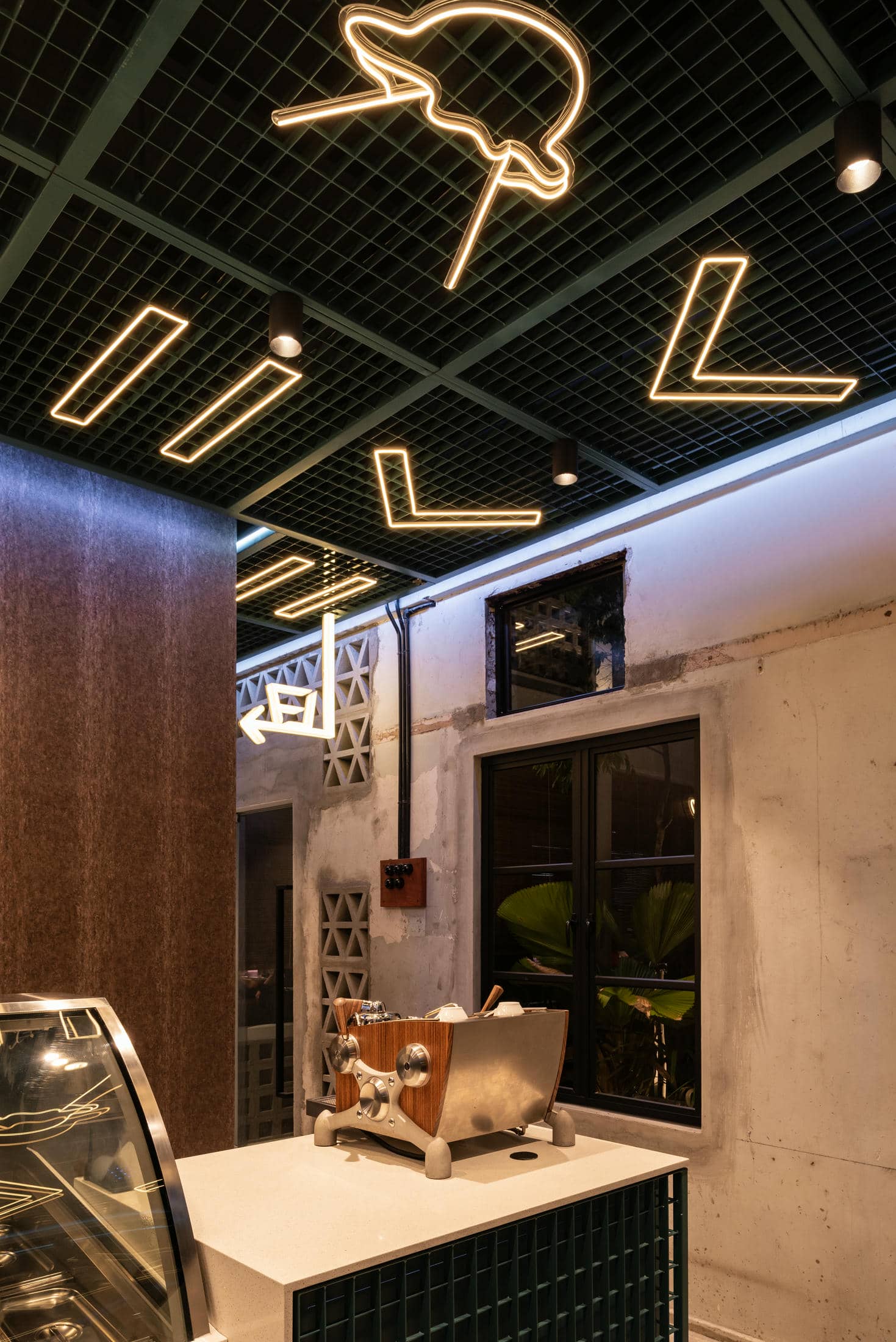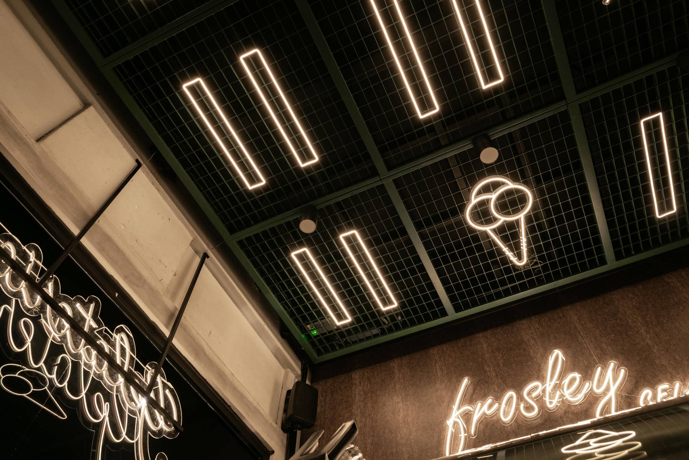 A metal netting ceiling and counter design seamlessly tie in the symbols on the ceiling, helping to represent the ebb and flow of the Frank Laurent experience. In addition, we curated a vibrant color palette and artistic lightning ambiance to create the perfect experience for couples on a date, families out for a stroll, and even for the coffee connoisseurs to enjoy an affogato. With built-in lighting effects, you can create any kind of environment you want, no matter the event.