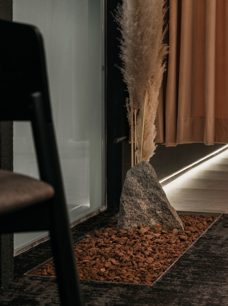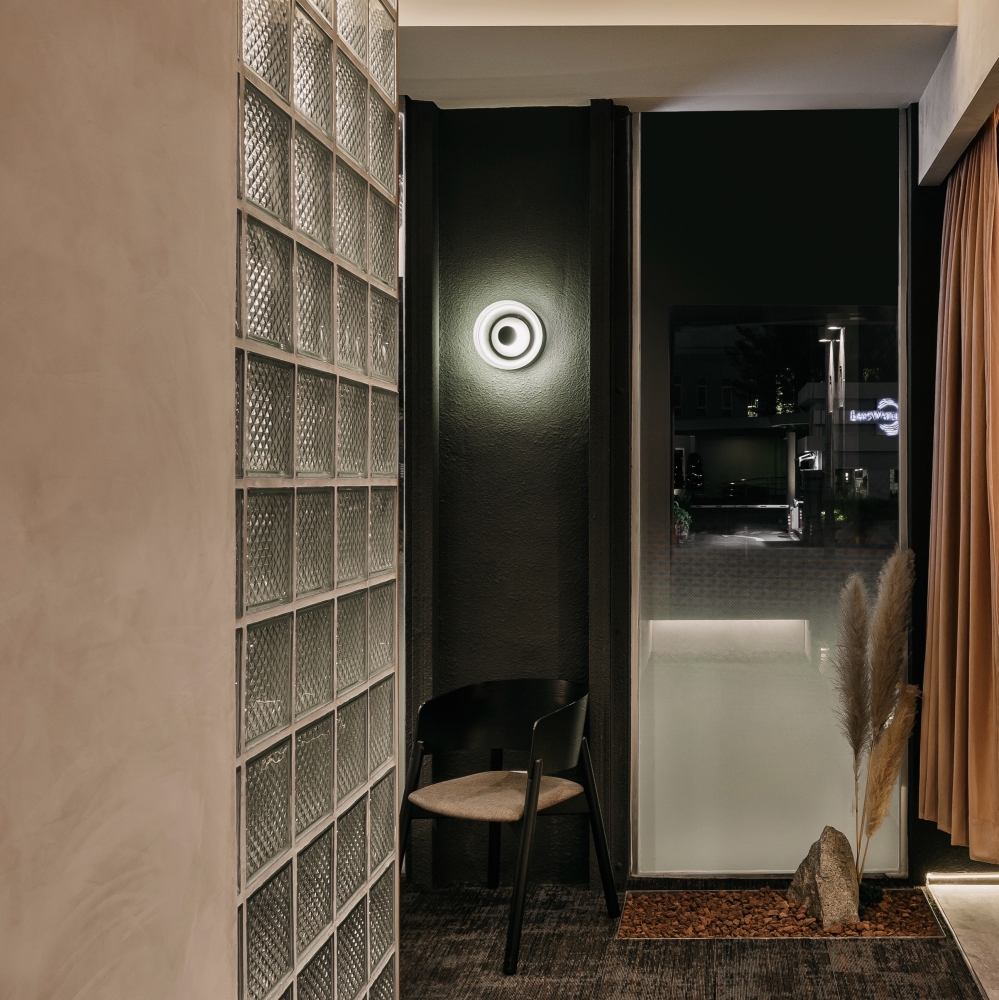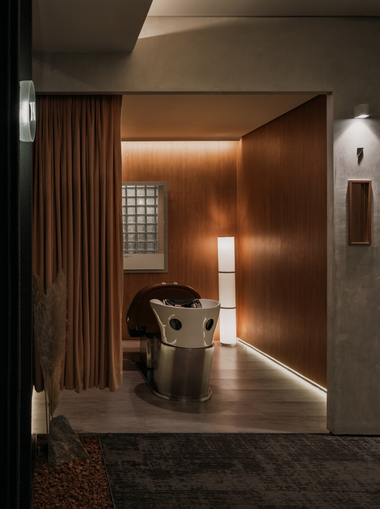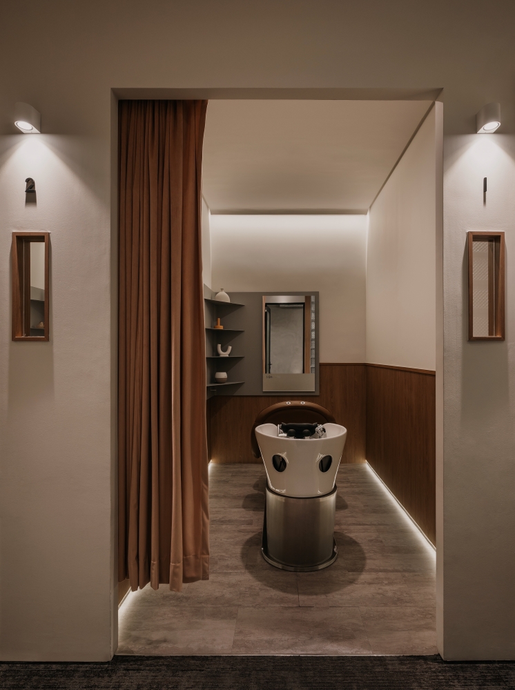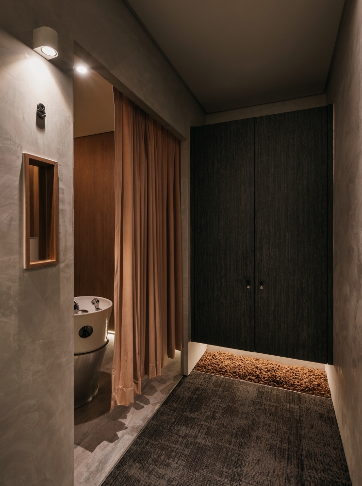 Incorporating nature into every aspect of the space, the different elements of a mountain range was adopted to reflect this. The general spaces of the reception and the corridor are lined with walls of stone-like colour and pattern. Coupled with carpeted floor of similar colour gradients, further tying in this concept in the entire space. These features are not merely decorative but many double as useful storage spaces such as the stone-coloured hair washing basins in each treatment room, as well as the large stone textured feature wall that is also a hidden storage cabinet.