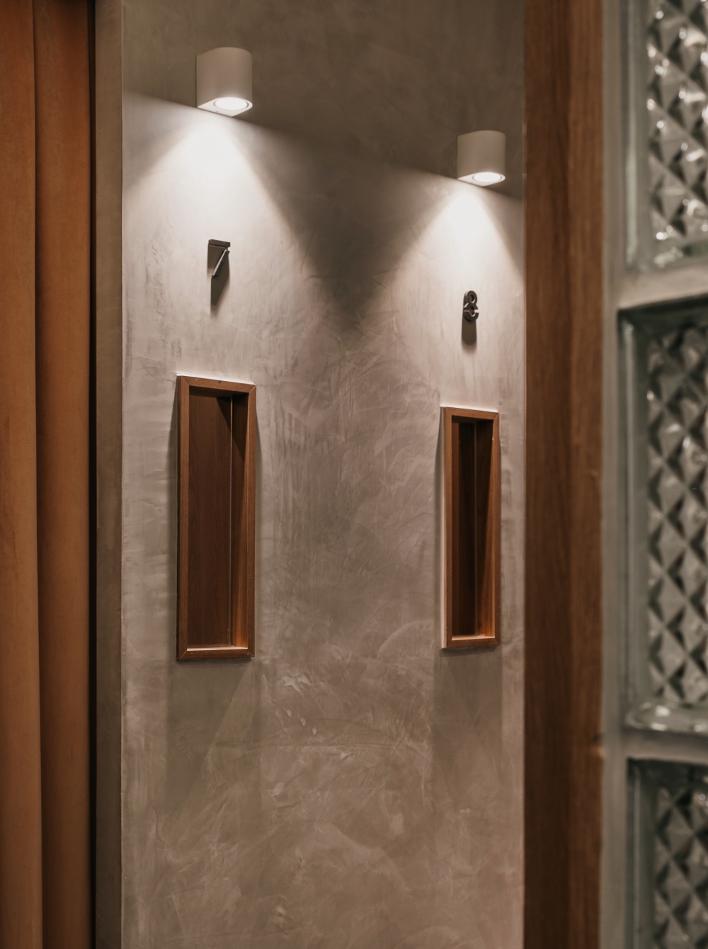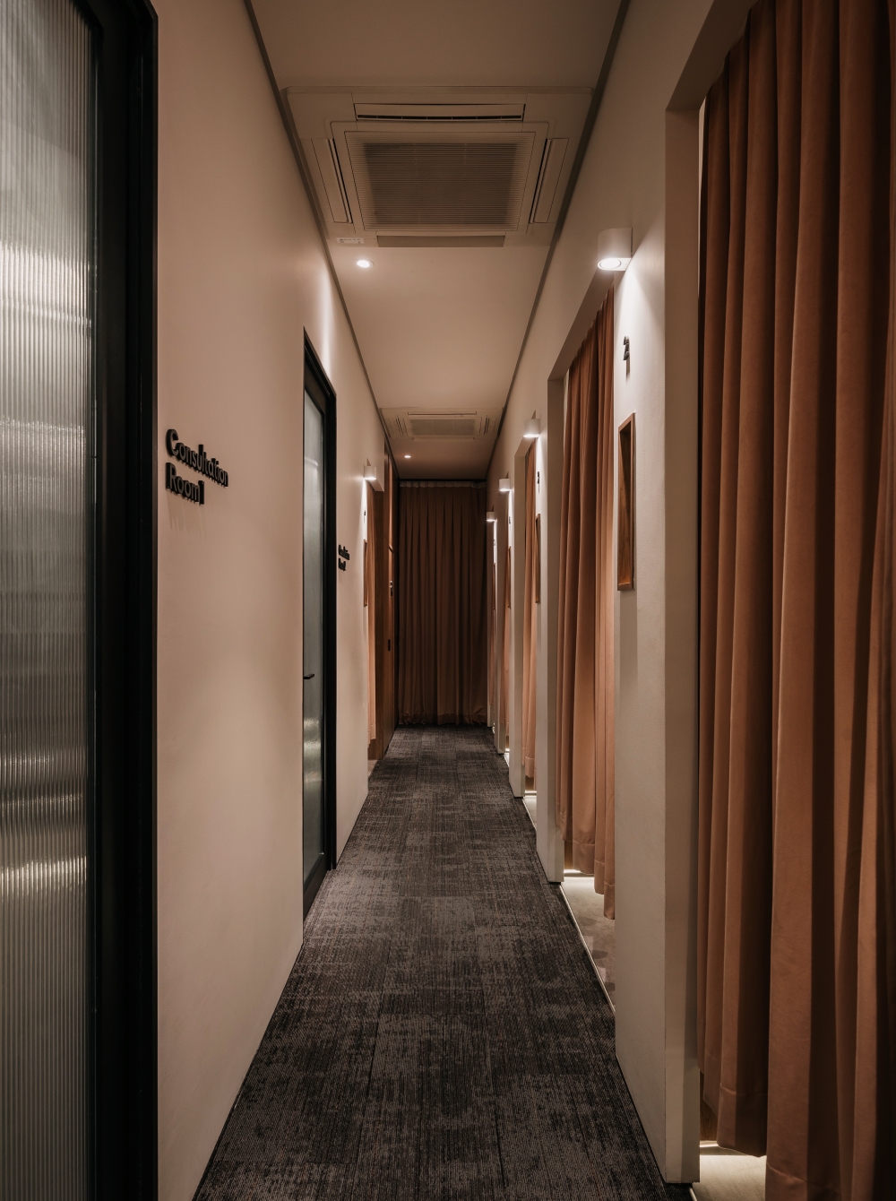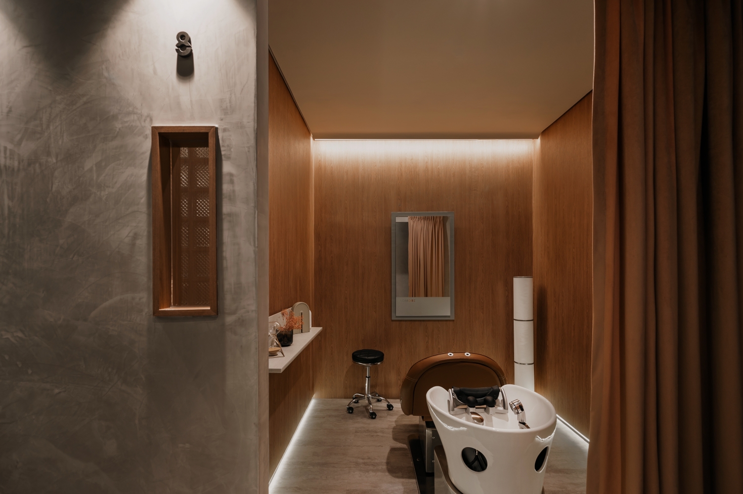 Incorporating nature into every aspect of the space, the different elements of a mountain range was adopted to reflect this. The general spaces of the reception and the corridor are lined with walls of stone-like colour and pattern. Coupled with carpeted floor of similar colour gradients, further tying in this concept in the entire space. These features are not merely decorative but many double as useful storage spaces such as the stone-coloured hair washing basins in each treatment room, as well as the large stone textured feature wall that is also a hidden storage cabinet.