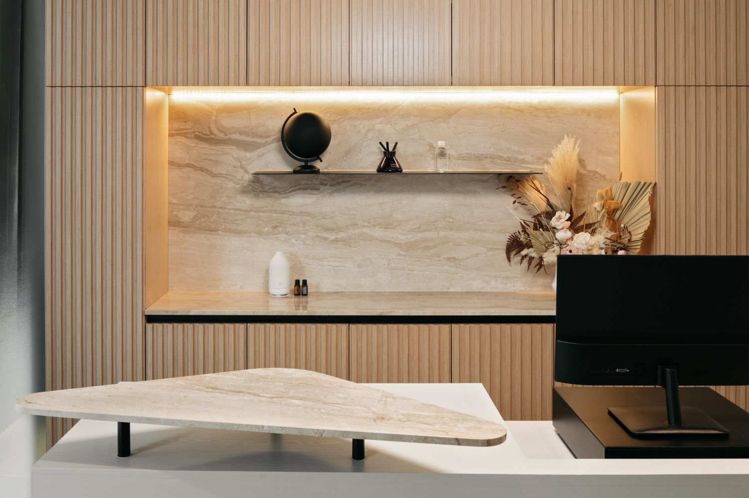 Upon arrival, our entrance counter beckons with the sleek presence of a computer, a gateway to unlocking your hair’s potential. As you traverse further, an inviting waiting area awaits you, a space where anticipation dances in the air, mirrored by the promise of transformation.