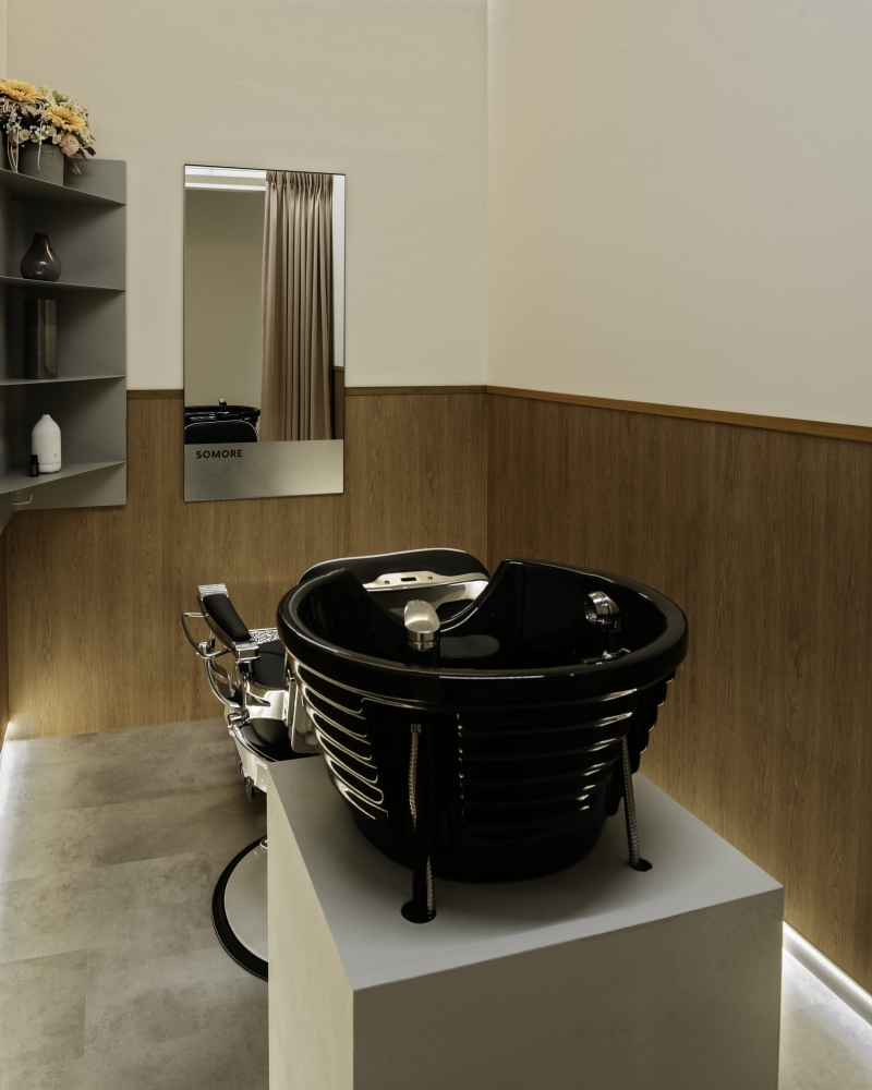 A curtain, reminiscent of light brown suede, whispers a secret as it veils the path to our exclusive treatment haven. Beyond its embrace lies an oasis of rejuvenation. Here, a striking black wash basin stands like a gurdian, its mirrored companion reflecting not just your reflection, but your aspirations too. It’s where our seasoned experts weave their magic, nurturing your hair to reveal its natural magnificence.
