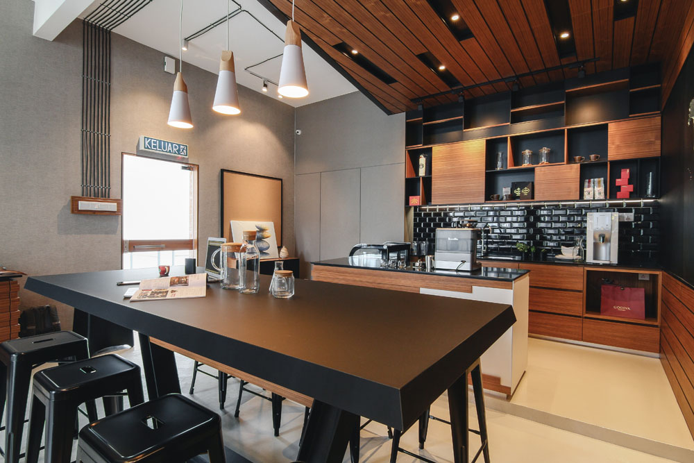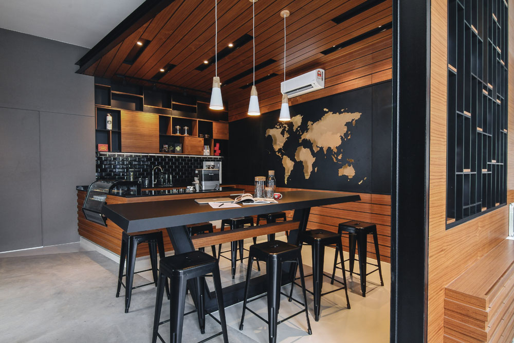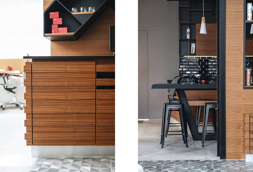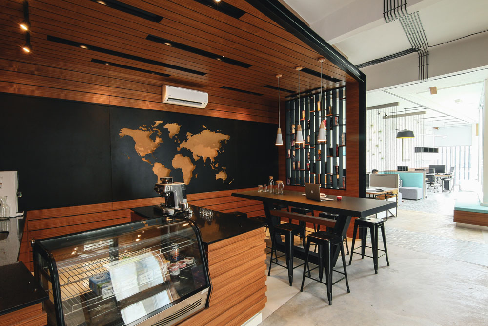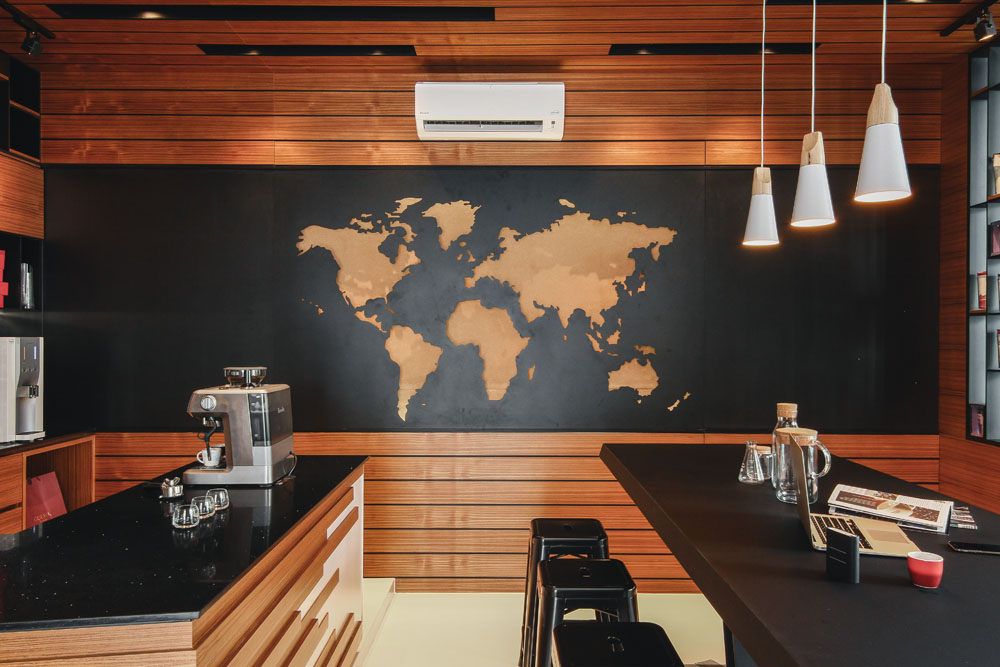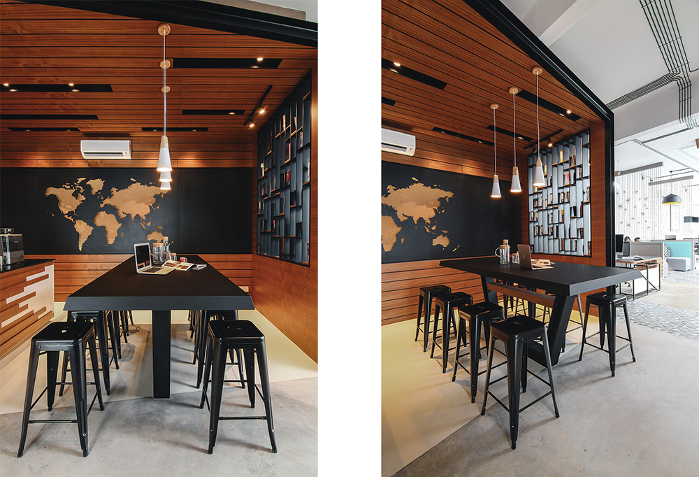 Upon entering the office, you will see the café corner and the wall art using black metal sheets with a laser-cut world map on top of cork backing which together showcases the company values in encouraging interaction, open discussion and serves as a reminder about the endless opportunities and diversity this world provides.