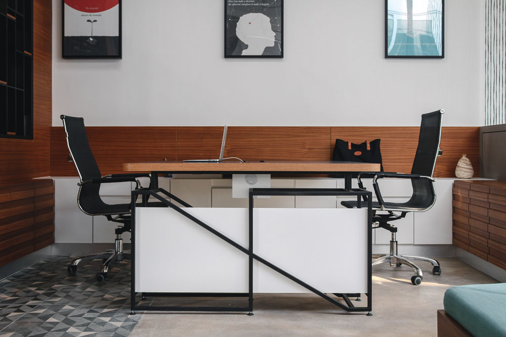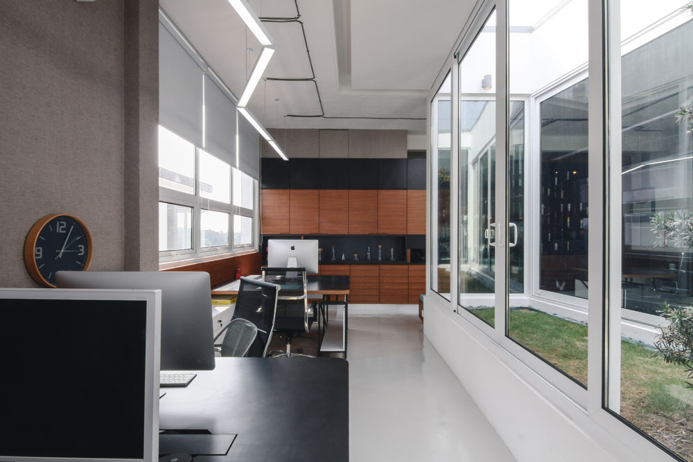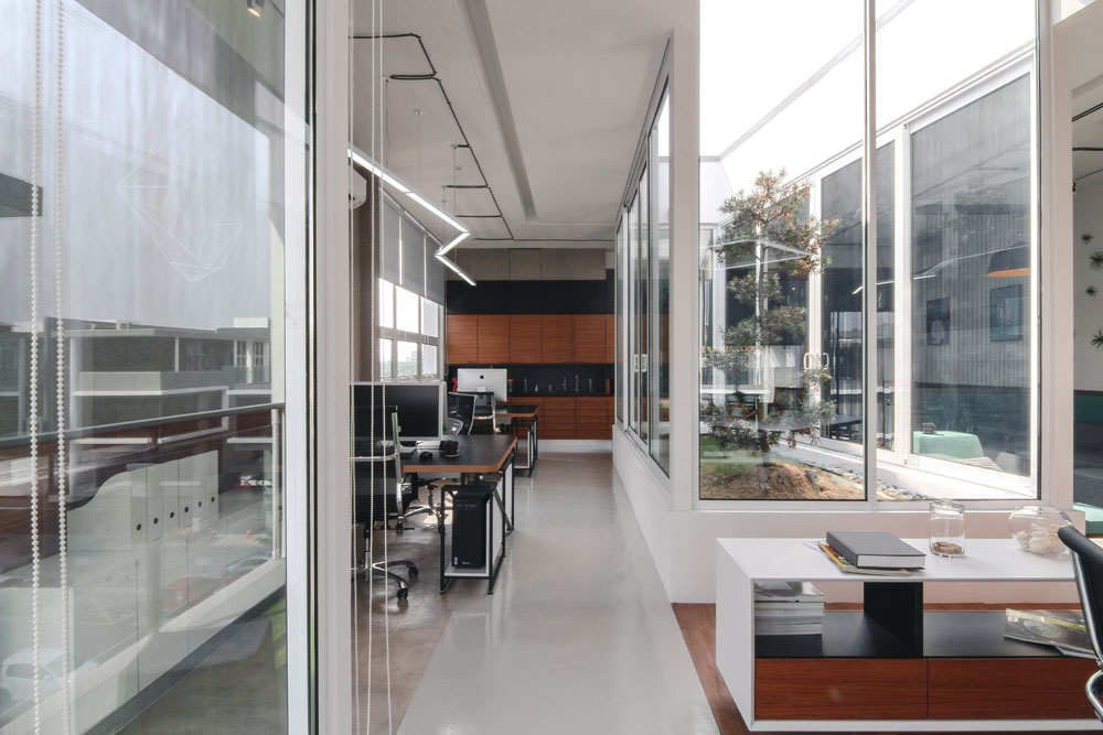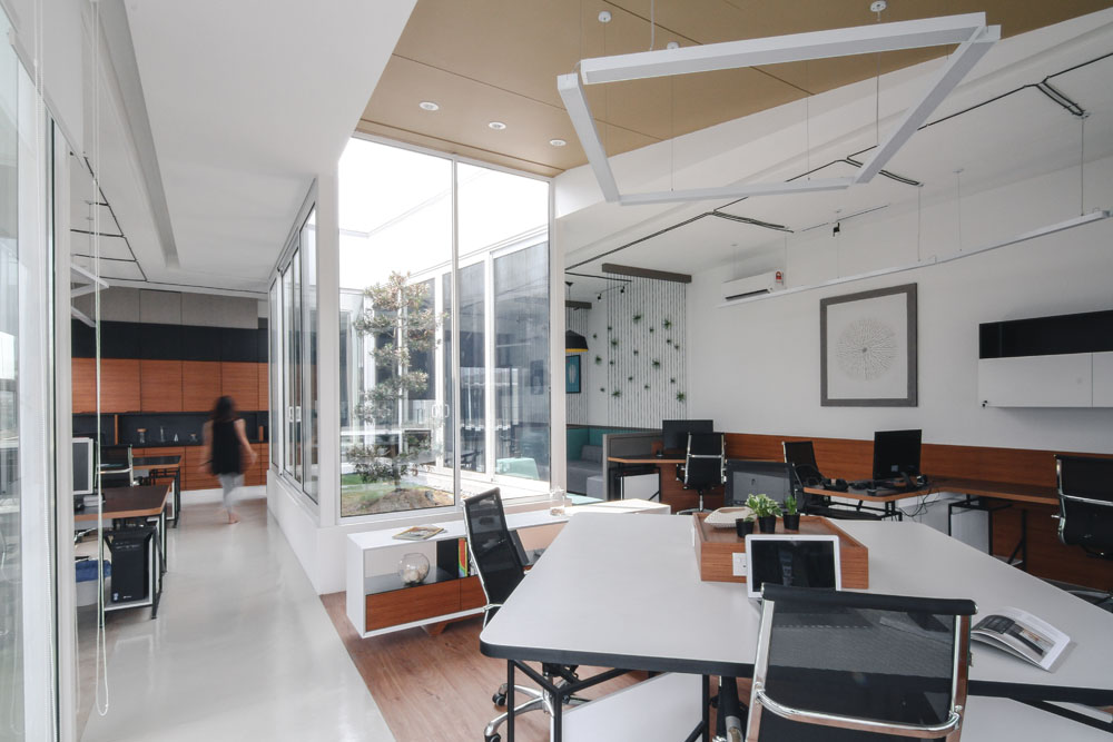 No suspended ceiling was deliberately used to ensure higher ceiling space to cleverly utilize the lines of the electrical wiring as linear guided paths throughout the office space and additionally cut costs.