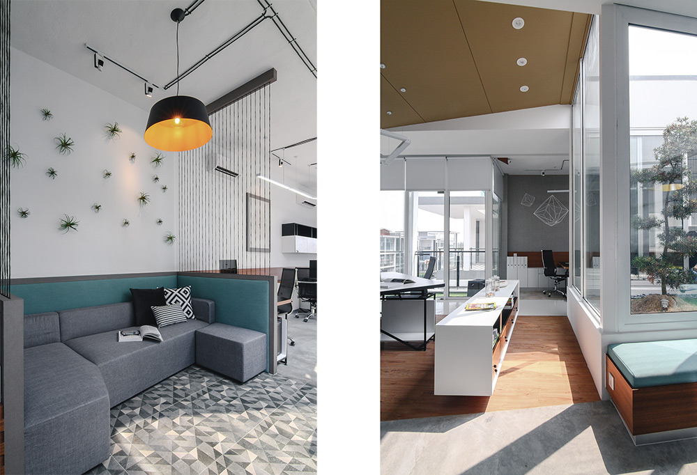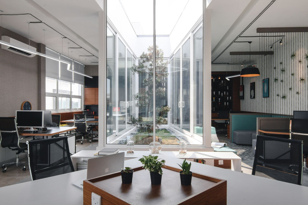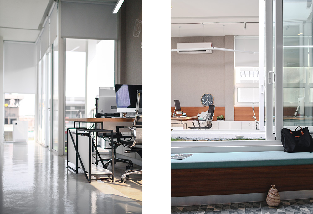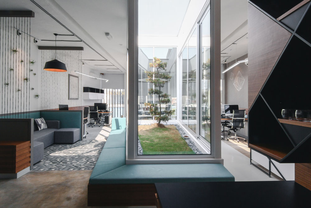 CHAOS Design Studio took the client’s challenge to convert a roof top terrace into an office and to move away from the traditional, mundane and grey office space and instead focus on a rewarding environment for the staff in form of relaxing ambience by incorporating the creative and buzzing environment of a contemporary café and strategically mixing resting areas and work space. By transforming the original space into its current design, nature is still subtly present through its courtyard providing ambience through abundance of natural light, fresh air and greenery set right in the heart of the office space.