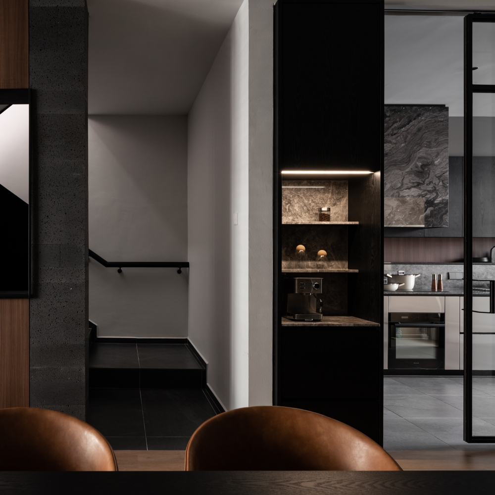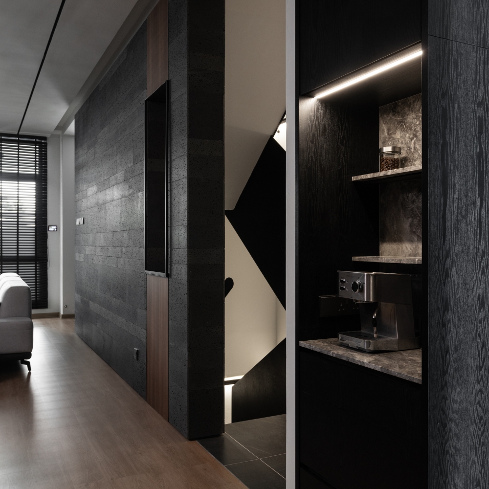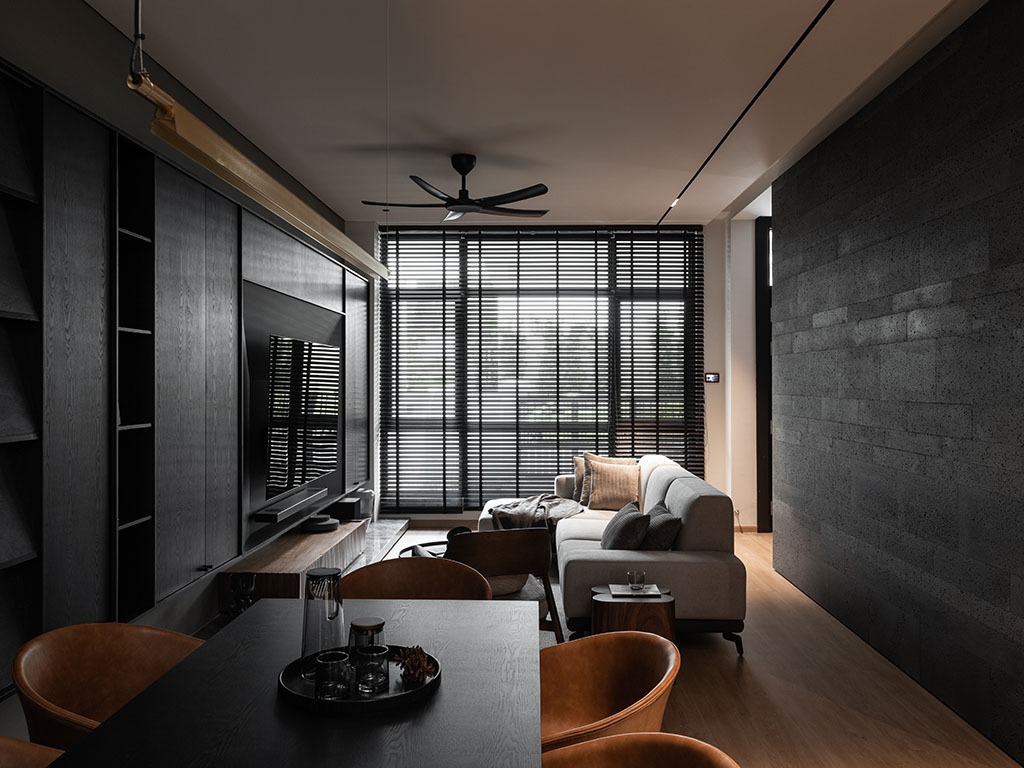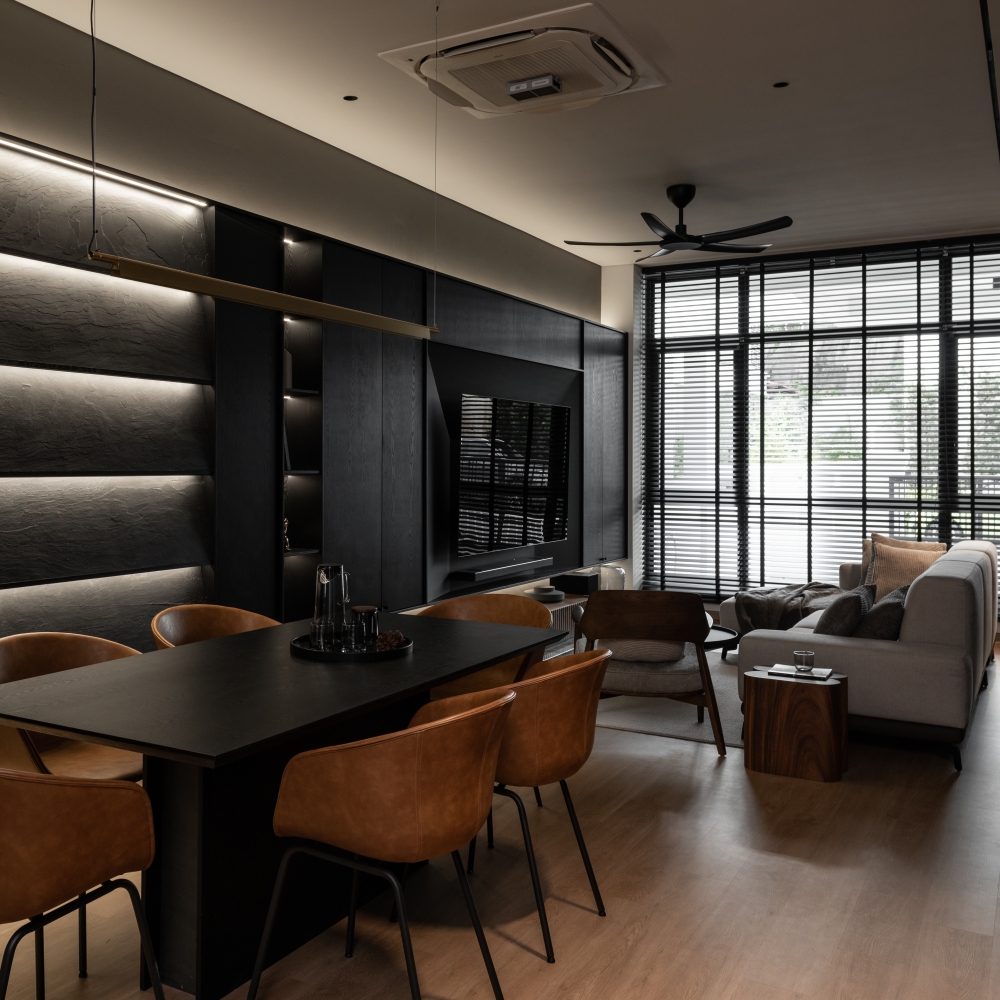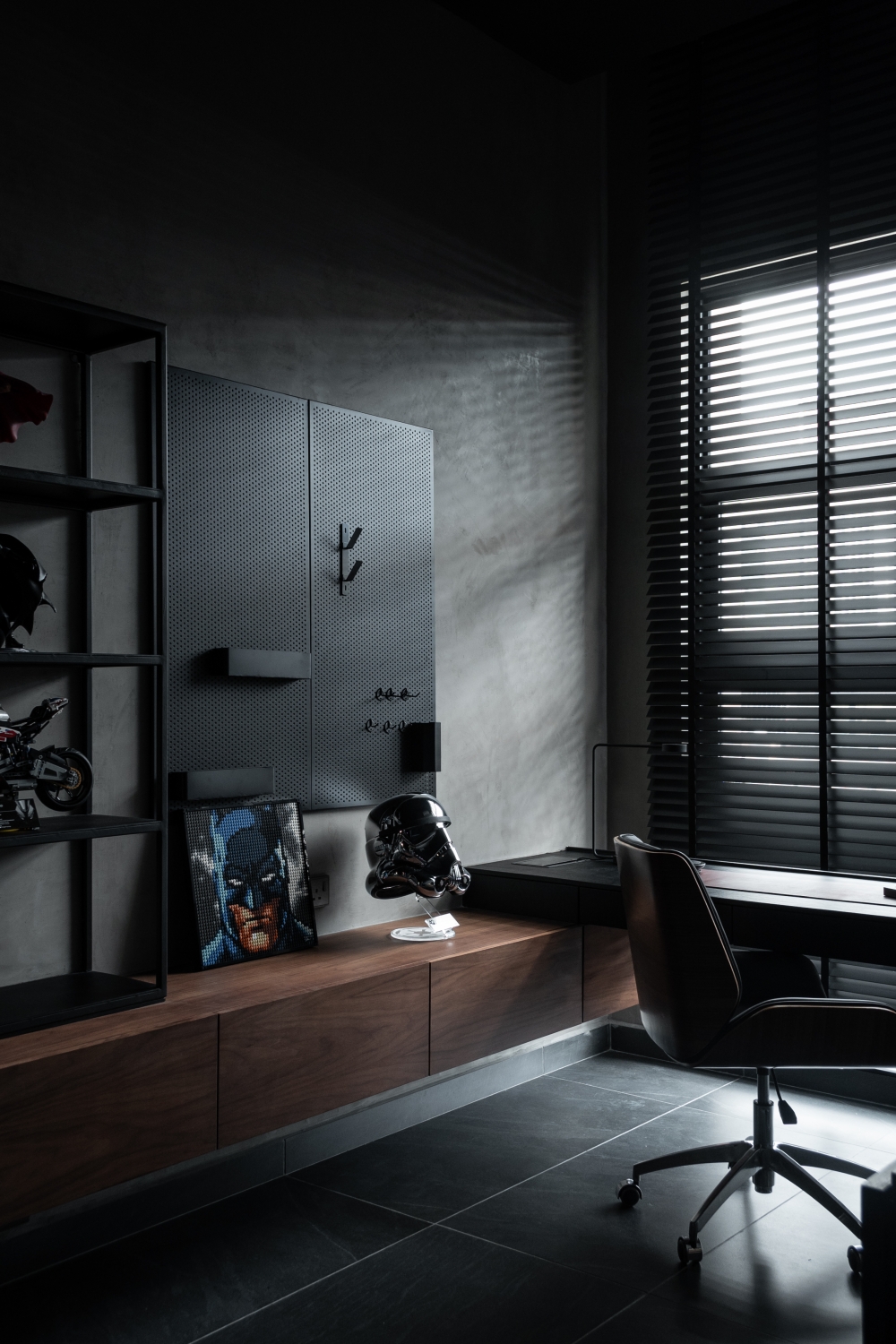 Kresidence, in Penang, is a home that is truly tailored to its owner. Minimalistic, bold and masculine with a touch of rustic elegance, is all bought together in each space through a consistent use of variety of stone, wood and metal elements. Stone elements are such as marble, lava stone and rough stone are used in combination with black wooden details and metallic elements in the living room and kitchen designs. Two unique rooms featured in this project stand out from the other spaces while still managing to work harmoniously well as a whole. Daughter’s room showcases pops of colours not seen in most parts of the house; however, the use of colours and warm lighting cohesively tie it in. Like his daughter, the man of the house also has his private area- the mancave where he can go to wind down and focusing his hobbies. Housing all his hobbies and artistic endeavors, space is maximized by creating hidden storage spaces that are made available and useful as they are aesthetically pleasing. In this space where colours and elements seem overwhelmingly earthy, an ample sense of space and lighting becomes key to brightening up the space. Full glass panels and windows allow for a sense of privacy yet possess permeability of interaction and light. Several structures in the house have also been made to open up the space to more natural light and the surrounding nature.