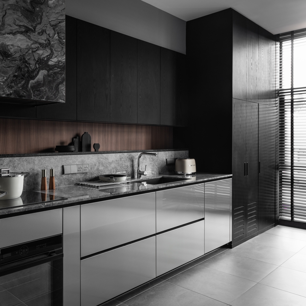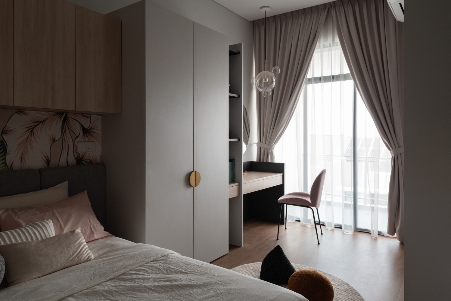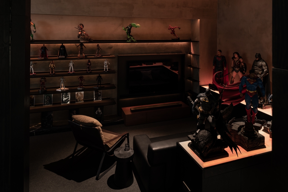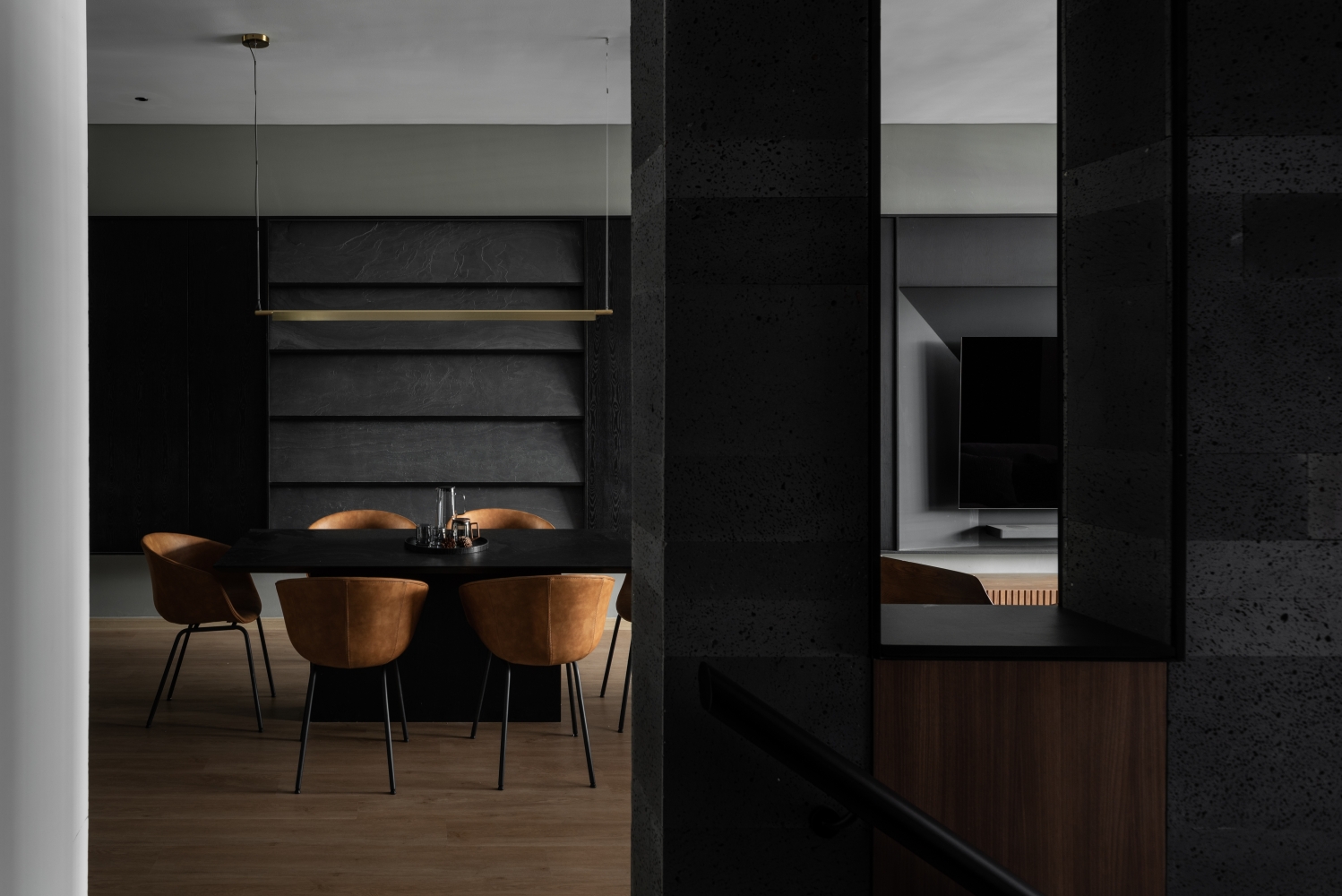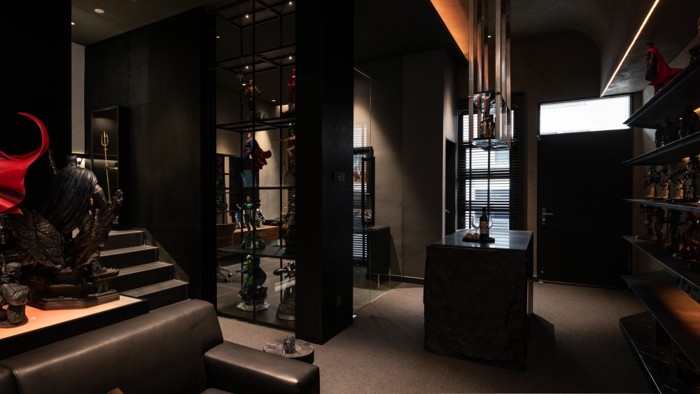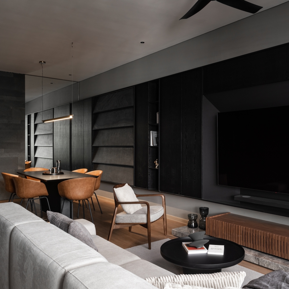 Kresidence, in Penang, is a home that is truly tailored to its owner. Minimalistic, bold and masculine with a touch of rustic elegance, is all bought together in each space through a consistent use of variety of stone, wood and metal elements. Stone elements are such as marble, lava stone and rough stone are used in combination with black wooden details and metallic elements in the living room and kitchen designs. Two unique rooms featured in this project stand out from the other spaces while still managing to work harmoniously well as a whole. Daughter’s room showcases pops of colours not seen in most parts of the house; however, the use of colours and warm lighting cohesively tie it in. Like his daughter, the man of the house also has his private area- the mancave where he can go to wind down and focusing his hobbies. Housing all his hobbies and artistic endeavors, space is maximized by creating hidden storage spaces that are made available and useful as they are aesthetically pleasing. In this space where colours and elements seem overwhelmingly earthy, an ample sense of space and lighting becomes key to brightening up the space. Full glass panels and windows allow for a sense of privacy yet possess permeability of interaction and light. Several structures in the house have also been made to open up the space to more natural light and the surrounding nature.