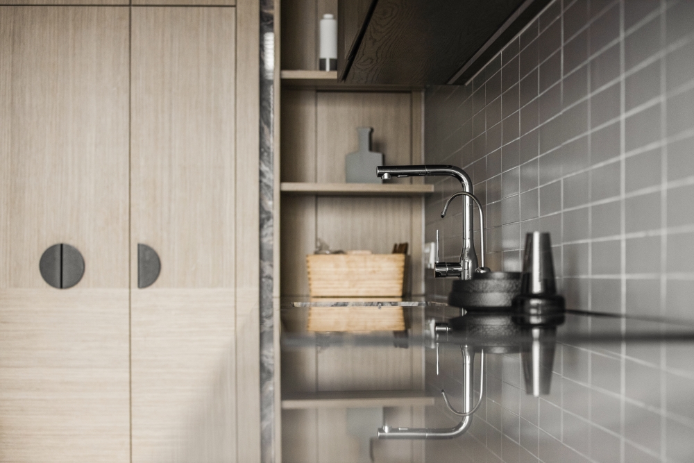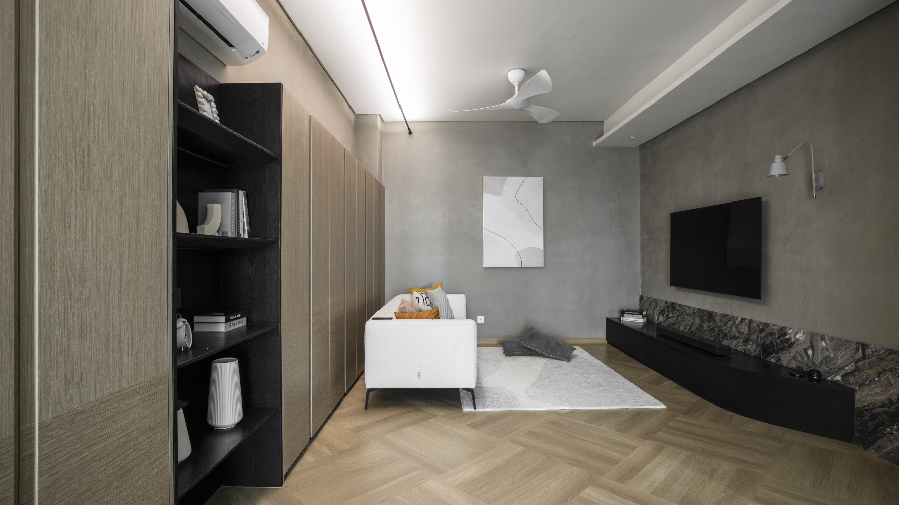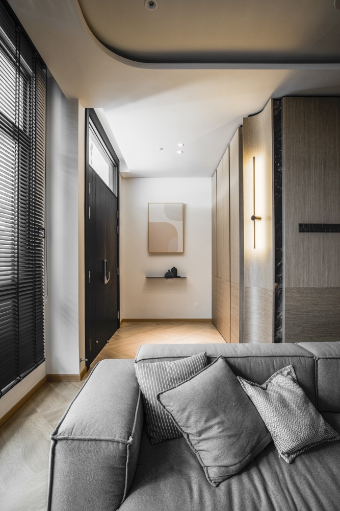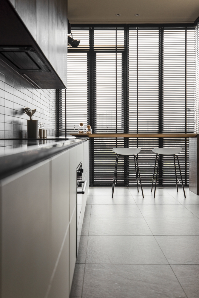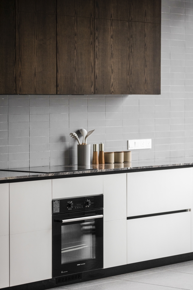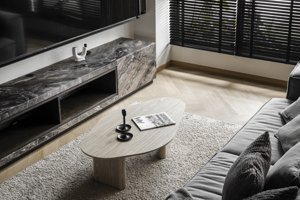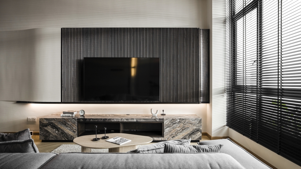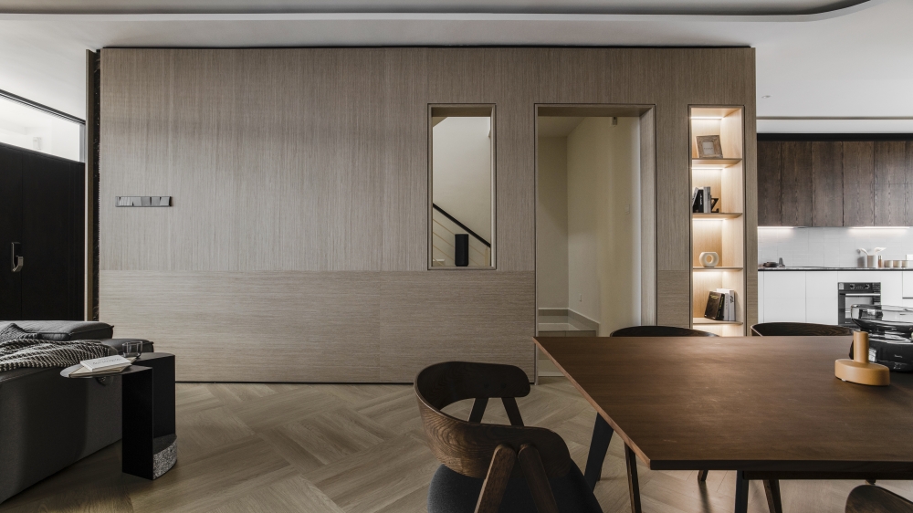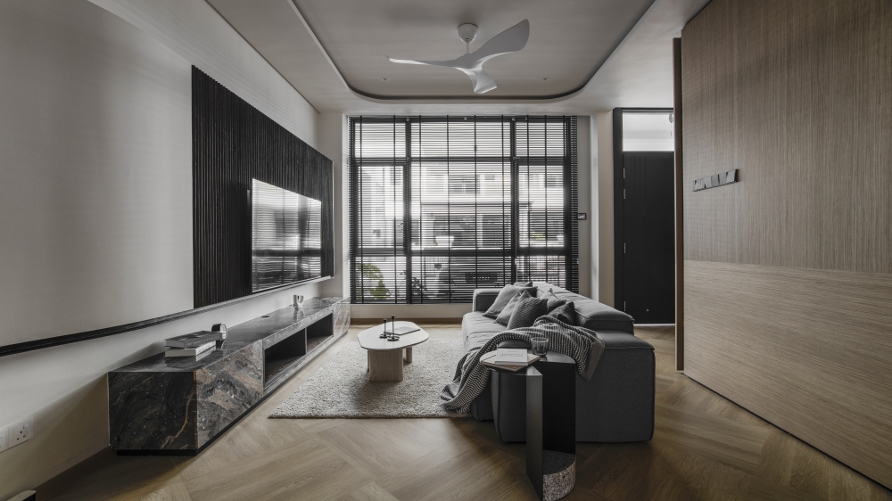 Consisting of a basement, first and second floor, this project in Stramax Residences, is a leisurely home where the family comes together as one. The backdrop of the home is a plain and clean one, with a general colour of desaturated off-white on the ceilings and walls. The simplicity of the surroundings is accompanied by a similar colour palette of various shades of grey and beige in the other fixtures and furniture. The seemingly plain spaces are however, accented by a variety of patterns, textures and materials, as well as through feature pieces and bespoke loose furniture that can be seen all around the house. The elegant tray ceilings of the living room and kitchen, the natural flow of the wardrobe and work desk as well as the sleek looking TV panel and master bedroom bed head; showcase the thoughtful use of subtle curves to add distinctiveness to the entire house. The design is further enhanced through the combination of marble and wood used extensively in many feature pieces. The calm but raw nature of wood is complemented by the strong but sophisticated look of the marble in the TV panel and the console table. Despite giving off opposite feelings, they blend amicably from one to the other in the bed head of the master bedroom. The use of repetitive but opposing patterns in the feature pieces of each space is also another element of embellishment to the simple design. The design of the TV panel and the bed head feature wood aligned vertically one after the other, while at the same time horizontally aligned window blinds are also used in those spaces. This play in patterns is seen even in the tiniest of details, such as the opposing direction of the grain of the wood on the top and bottom half of the storage cabinets in the kitchen and the family room. Finally, the use of bespoke loose furniture such as tables and lamps, truly add a unique touch to the house. A house becomes a home, when under one roof, unique personalities come together. Considerate detailing of each aspect allowed this simple design to become a harmonious home.