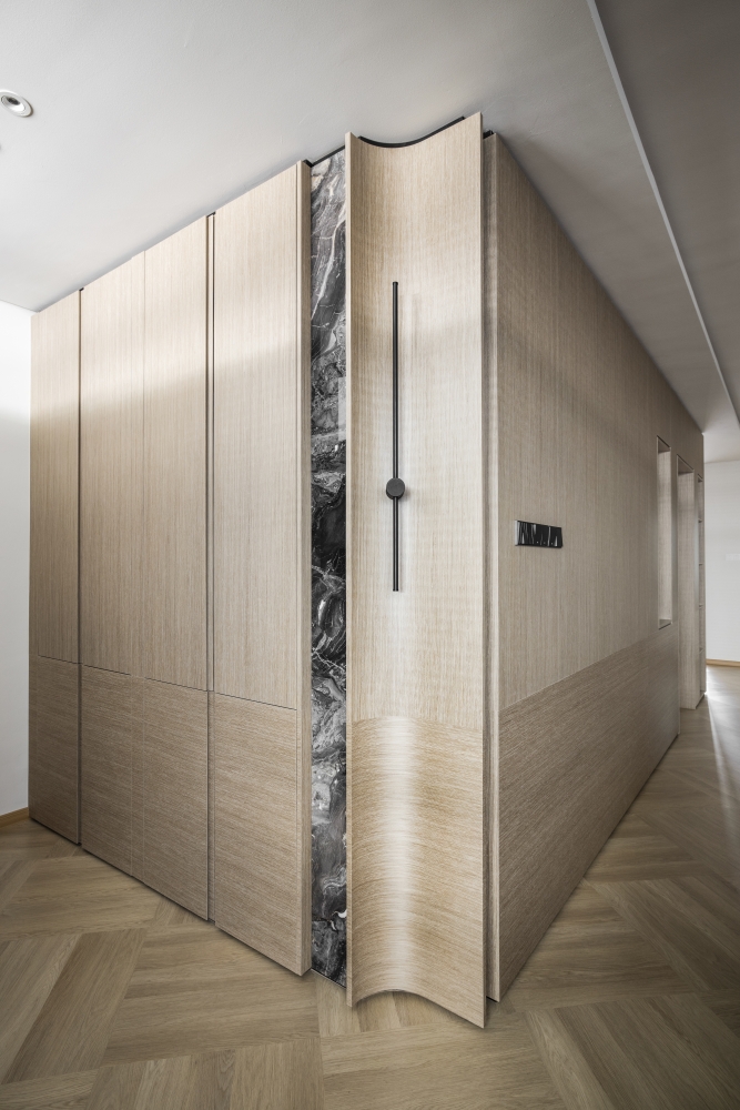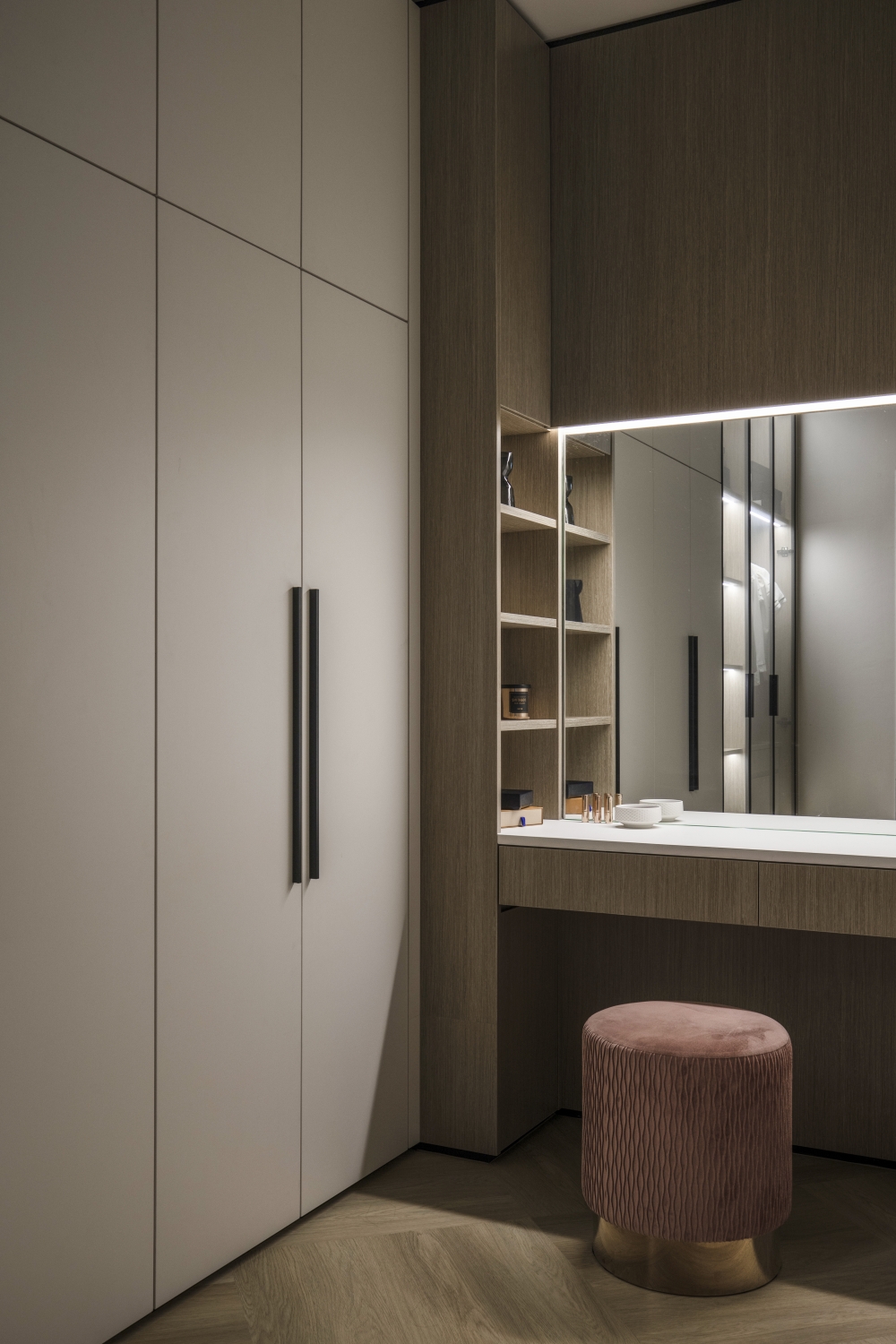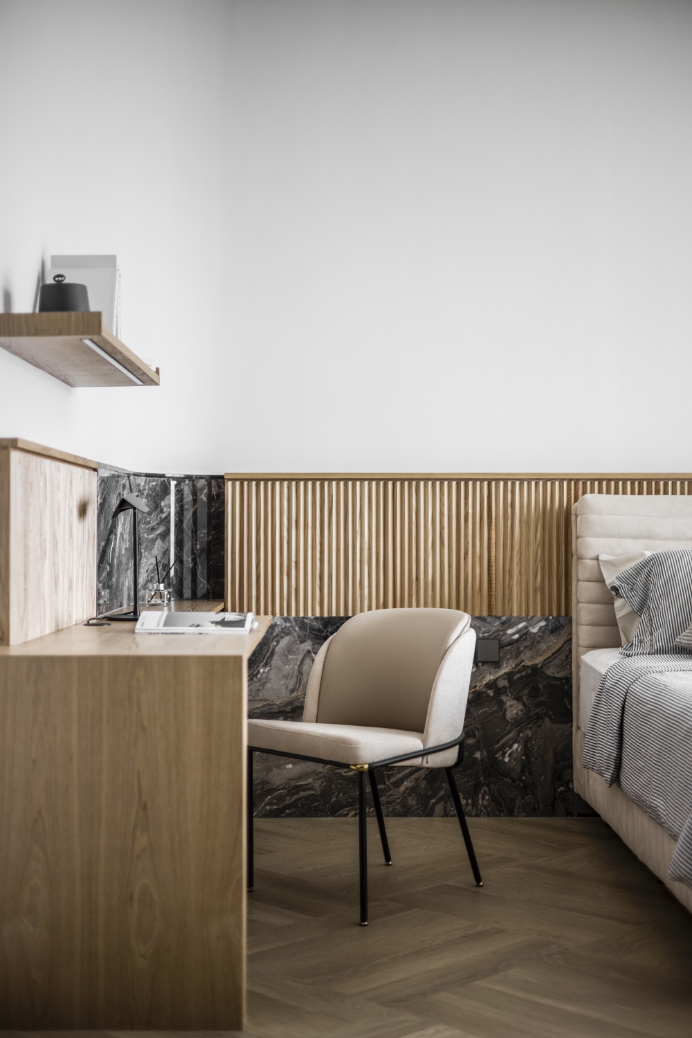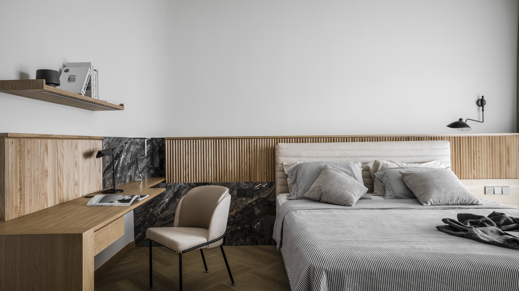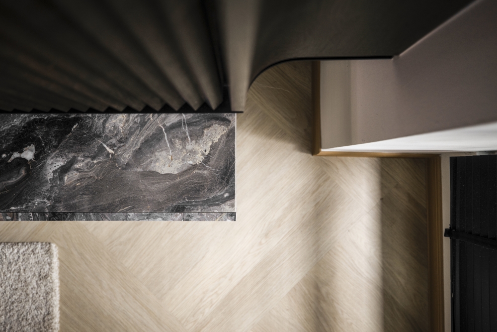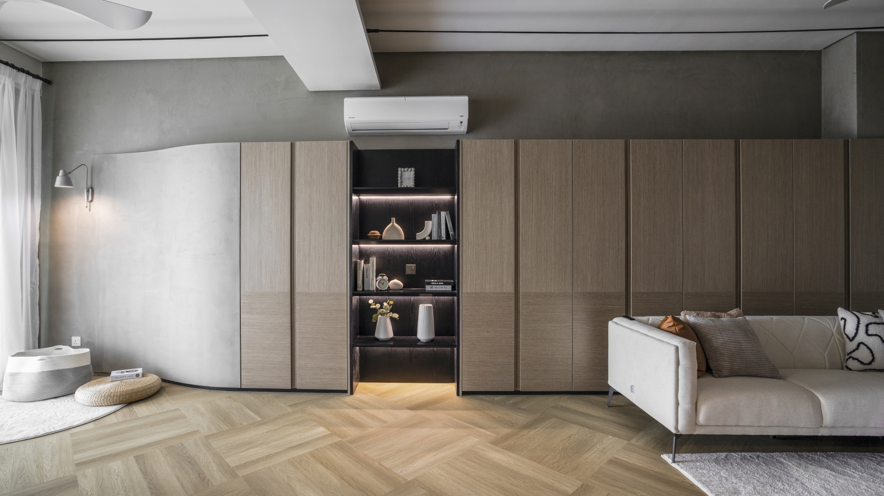 Consisting of a basement, first and second floor, this project in Stramax Residences, is a leisurely home where the family comes together as one. The backdrop of the home is a plain and clean one, with a general colour of desaturated off-white on the ceilings and walls. The simplicity of the surroundings is accompanied by a similar colour palette of various shades of grey and beige in the other fixtures and furniture. The seemingly plain spaces are however, accented by a variety of patterns, textures and materials, as well as through feature pieces and bespoke loose furniture that can be seen all around the house. The elegant tray ceilings of the living room and kitchen, the natural flow of the wardrobe and work desk as well as the sleek looking TV panel and master bedroom bed head; showcase the thoughtful use of subtle curves to add distinctiveness to the entire house. The design is further enhanced through the combination of marble and wood used extensively in many feature pieces. The calm but raw nature of wood is complemented by the strong but sophisticated look of the marble in the TV panel and the console table. Despite giving off opposite feelings, they blend amicably from one to the other in the bed head of the master bedroom. The use of repetitive but opposing patterns in the feature pieces of each space is also another element of embellishment to the simple design. The design of the TV panel and the bed head feature wood aligned vertically one after the other, while at the same time horizontally aligned window blinds are also used in those spaces. This play in patterns is seen even in the tiniest of details, such as the opposing direction of the grain of the wood on the top and bottom half of the storage cabinets in the kitchen and the family room. Finally, the use of bespoke loose furniture such as tables and lamps, truly add a unique touch to the house. A house becomes a home, when under one roof, unique personalities come together. Considerate detailing of each aspect allowed this simple design to become a harmonious home.