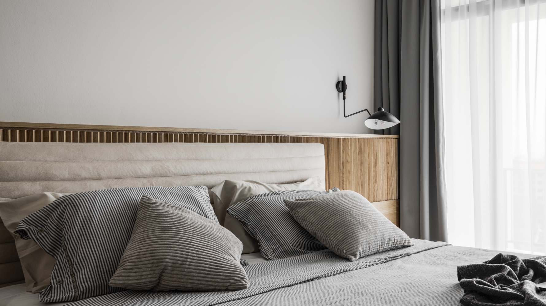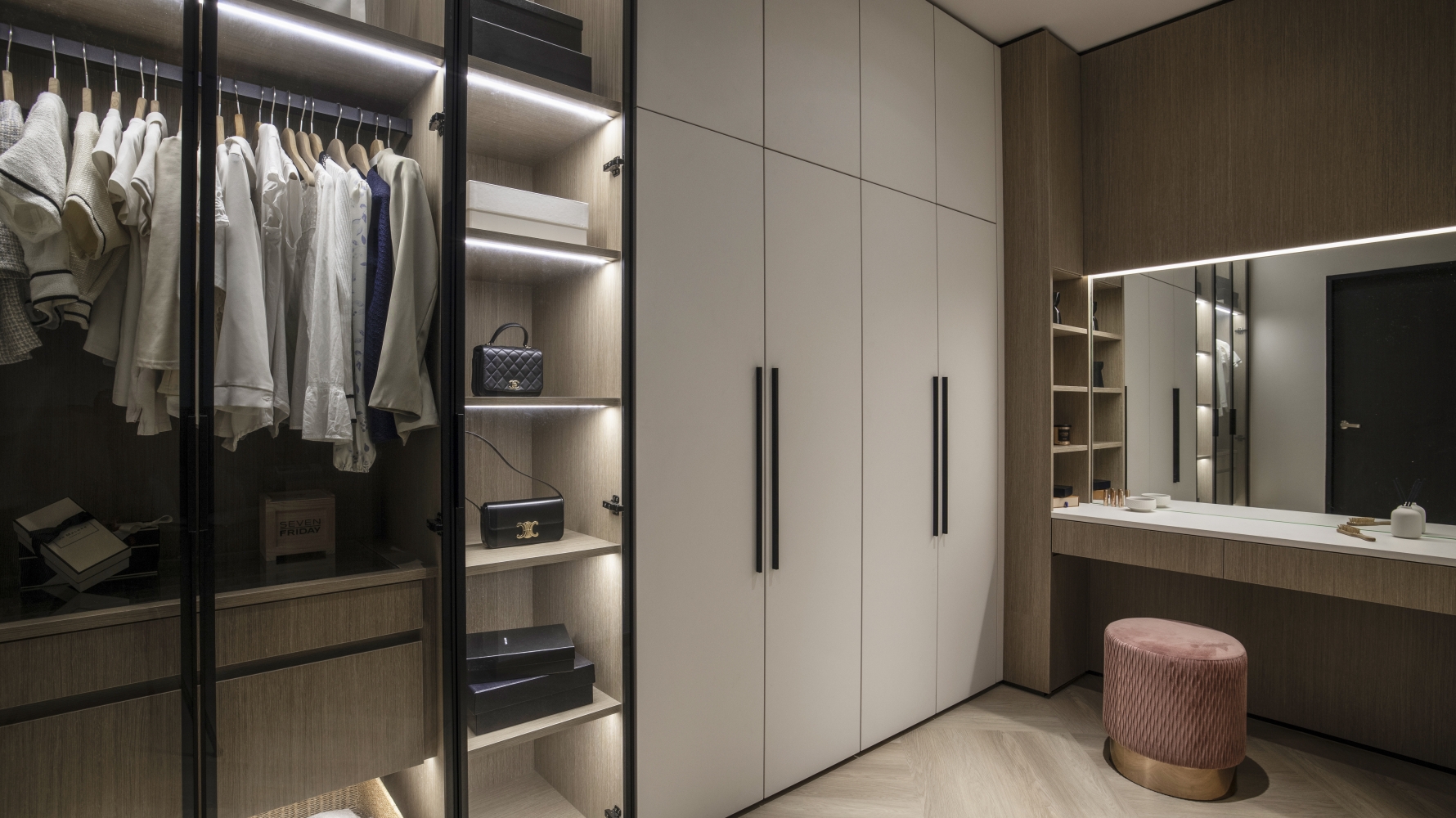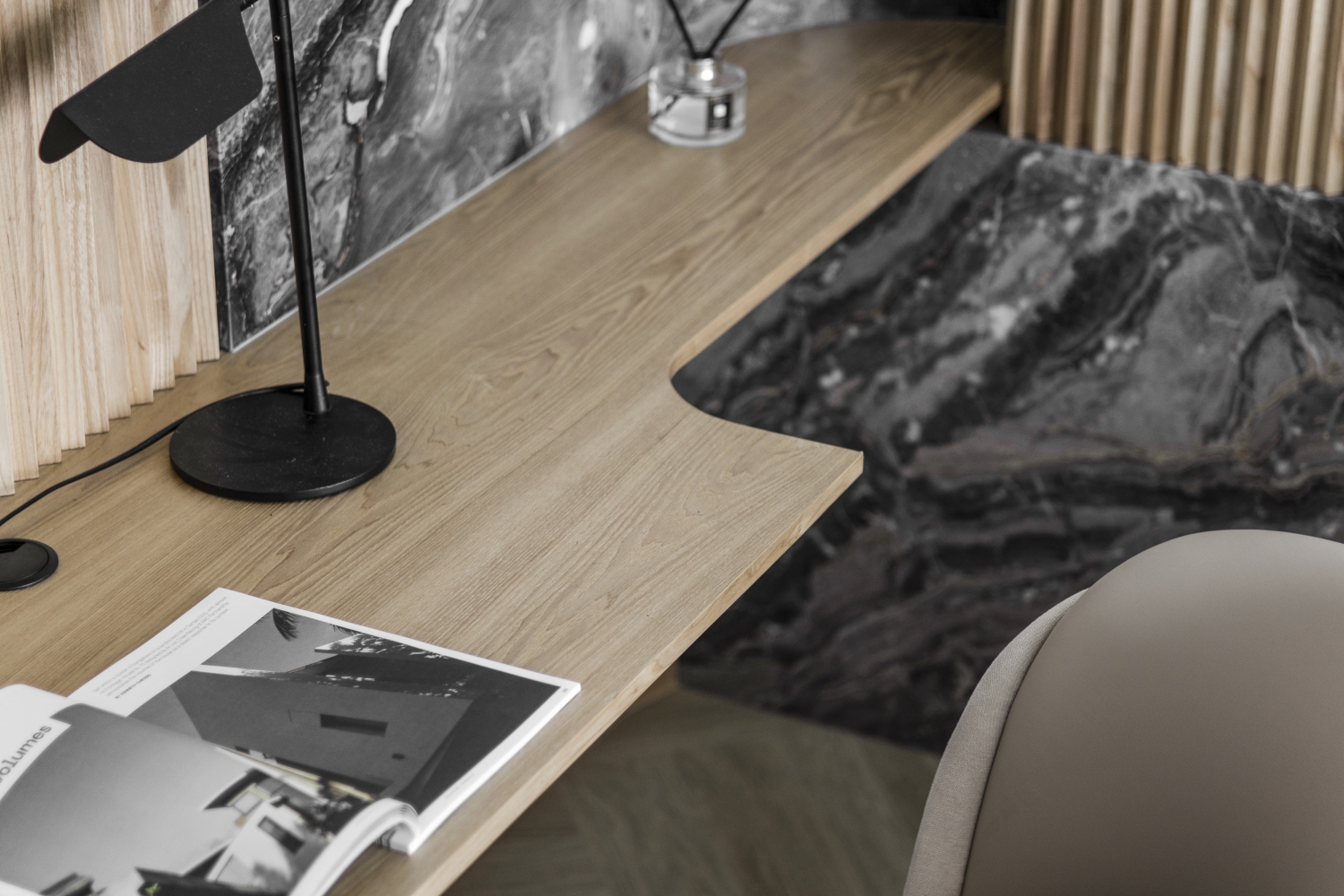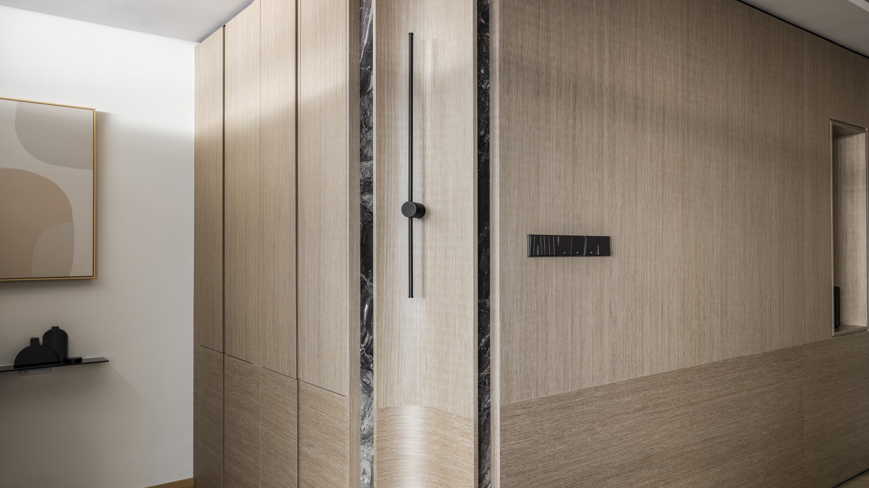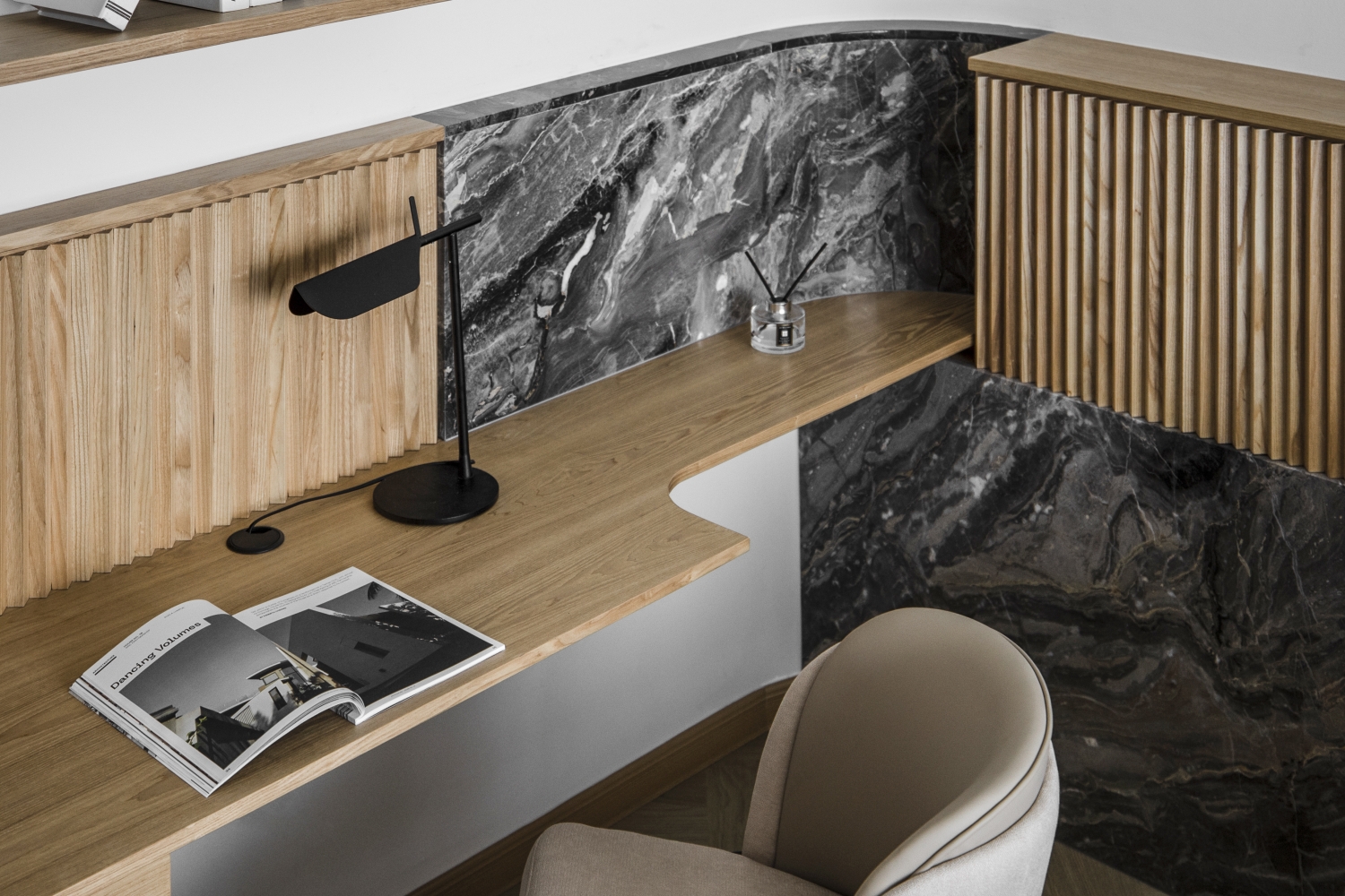 Consisting of a basement, first and second floor, this project in Stramax Residences, is a leisurely home where the family comes together as one. The backdrop of the home is a plain and clean one, with a general colour of desaturated off-white on the ceilings and walls. The simplicity of the surroundings is accompanied by a similar colour palette of various shades of grey and beige in the other fixtures and furniture. The seemingly plain spaces are however, accented by a variety of patterns, textures and materials, as well as through feature pieces and bespoke loose furniture that can be seen all around the house. The elegant tray ceilings of the living room and kitchen, the natural flow of the wardrobe and work desk as well as the sleek looking TV panel and master bedroom bed head; showcase the thoughtful use of subtle curves to add distinctiveness to the entire house. The design is further enhanced through the combination of marble and wood used extensively in many feature pieces. The calm but raw nature of wood is complemented by the strong but sophisticated look of the marble in the TV panel and the console table. Despite giving off opposite feelings, they blend amicably from one to the other in the bed head of the master bedroom. The use of repetitive but opposing patterns in the feature pieces of each space is also another element of embellishment to the simple design. The design of the TV panel and the bed head feature wood aligned vertically one after the other, while at the same time horizontally aligned window blinds are also used in those spaces. This play in patterns is seen even in the tiniest of details, such as the opposing direction of the grain of the wood on the top and bottom half of the storage cabinets in the kitchen and the family room. Finally, the use of bespoke loose furniture such as tables and lamps, truly add a unique touch to the house. A house becomes a home, when under one roof, unique personalities come together. Considerate detailing of each aspect allowed this simple design to become a harmonious home.