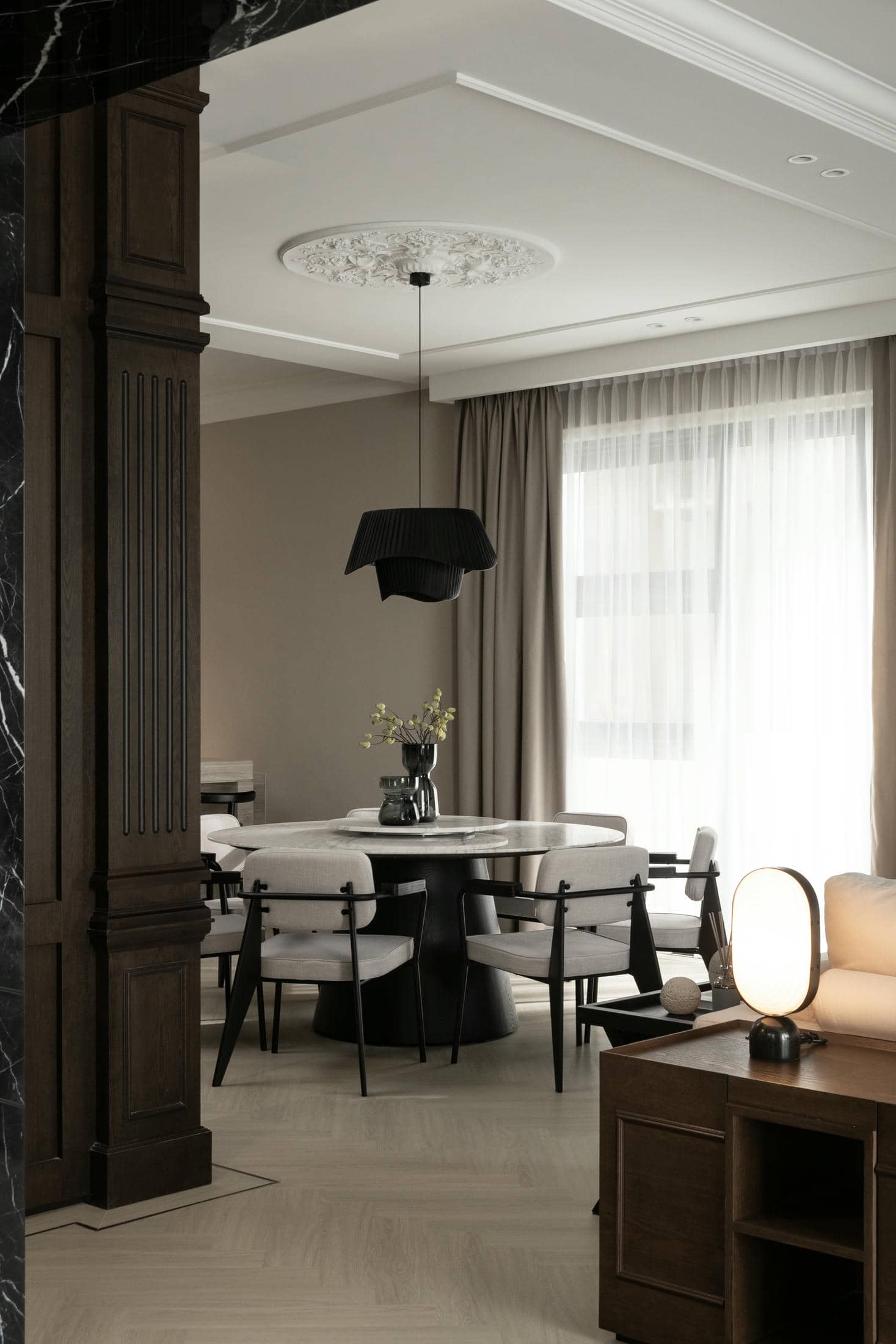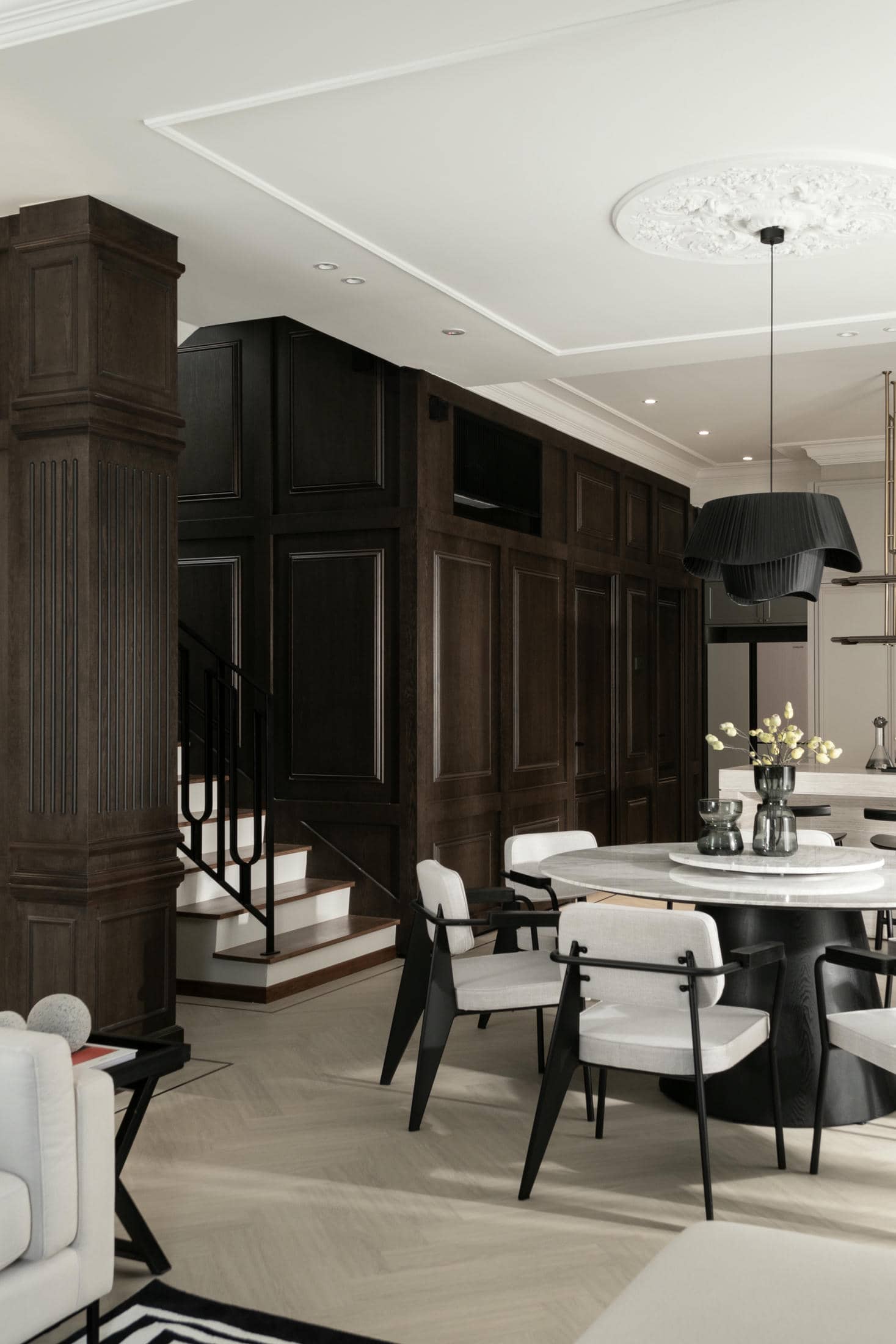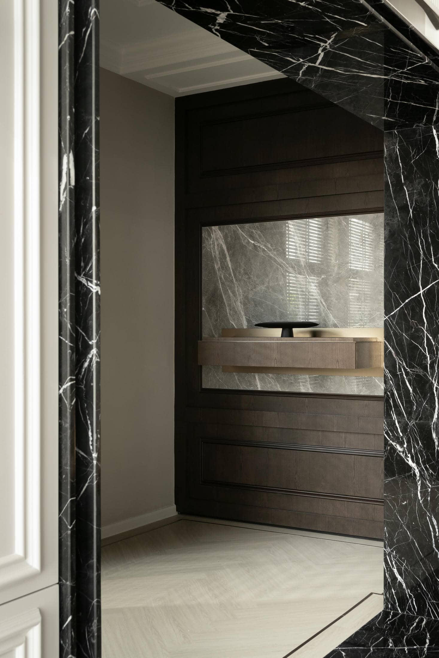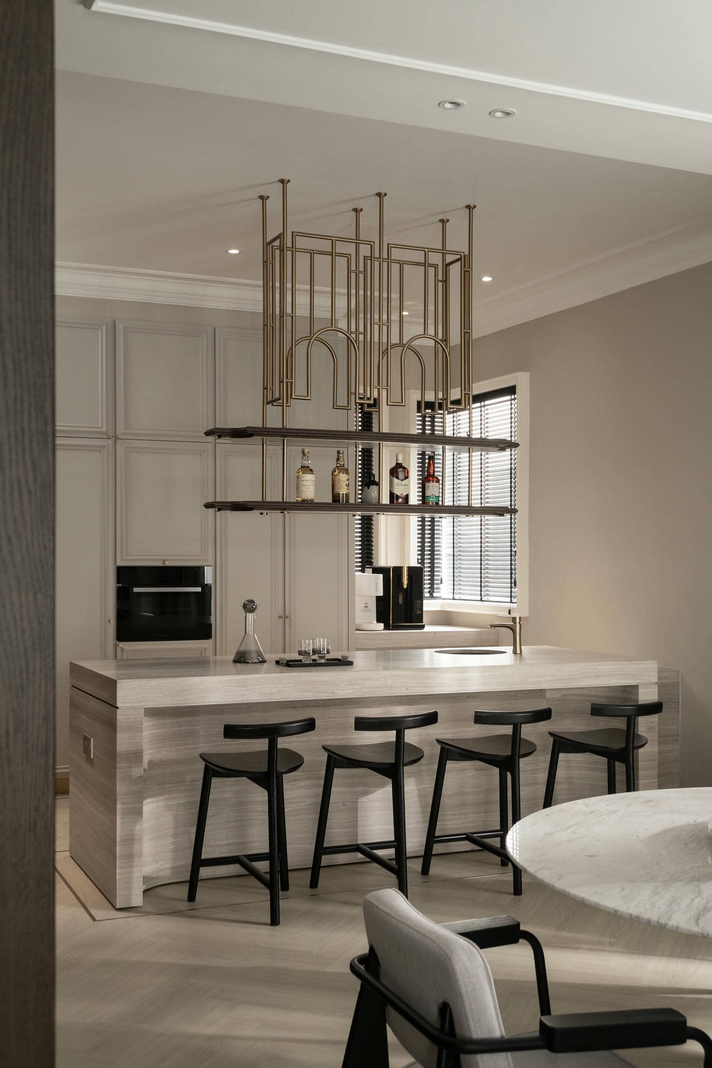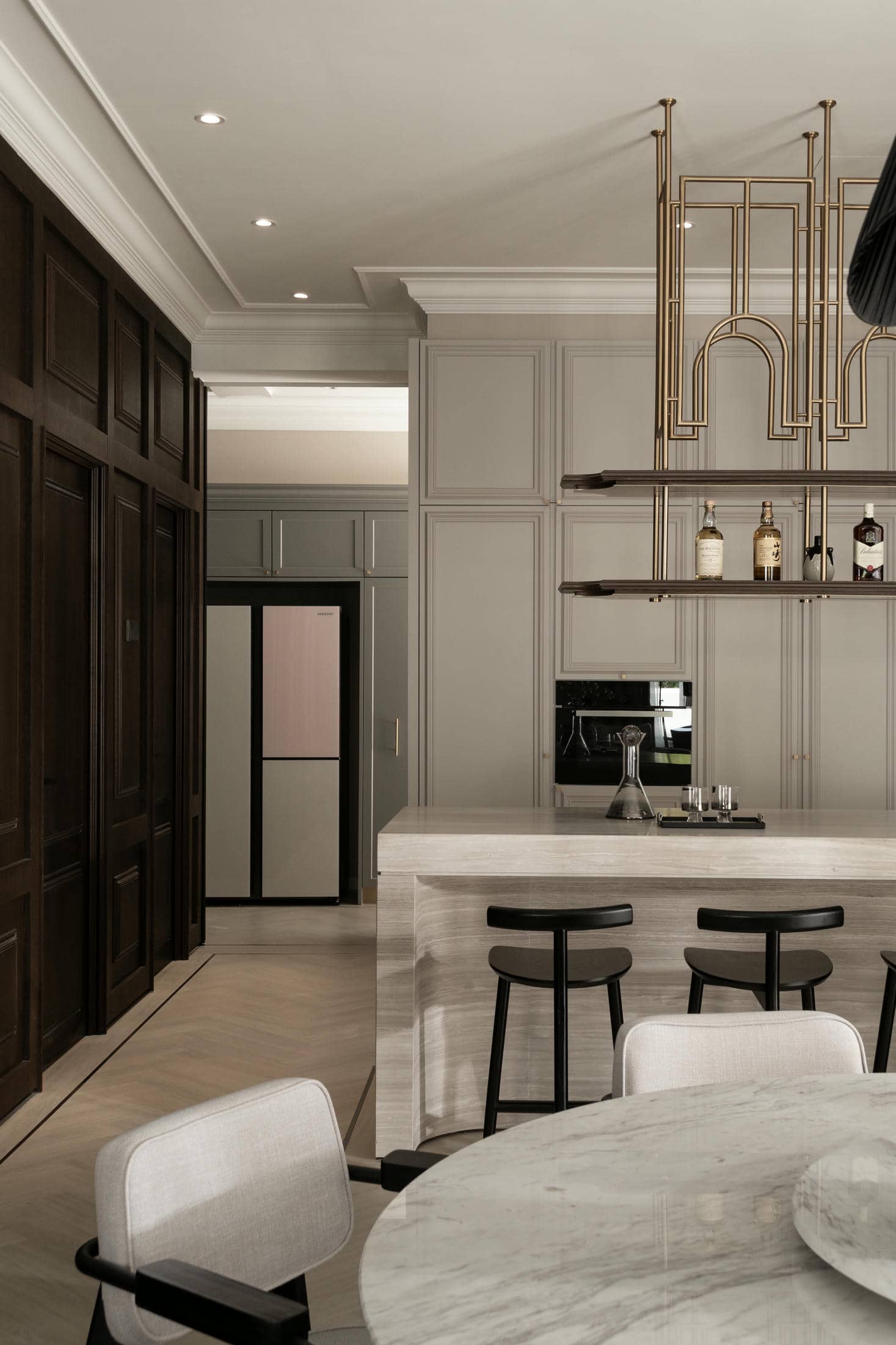 “Time Honoured Modernity” seamlessly merges timeless elegance and luxury with modern simplicity, creating spaces exuding dominance, power, and generational status. It crafts a union between classical beauty and contemporary chic, transforming the entire home into a sanctuary of elevated living. At its core, this signature style blends classical grandeur with sleek modern aesthetics, creating an atmosphere of refined elegance while preserving modern design simplicity. A curated palette of neutral and earthy tones wraps the surroundings, allowing classical and modern elements to coexist harmoniously. Custom and store-bought modern furnishings, such as Nero Black Marble walls and White Calacatta Marble dining tables, infuse opulence into every corner. These choices boast clean lines and minimalist designs, enhancing the play of light throughout the home. The integration of concave designs in elements like the kitchen island, dresser, and ceiling, along with wainscot classic detailing, PVD custom-made stainless-steel racks, ornate moldings, classical columns, arches, and soft, natural textures, introduce depth and visual intrigue without overwhelming the contemporary design. Chaos Design Studio’s philosophy revolves around the artful integration of intricate classical elements, merging classical beauty with modern simplicity. Meticulous craftsmanship and attention to detail cast a spell of dominance, power, and high status throughout the entire home.