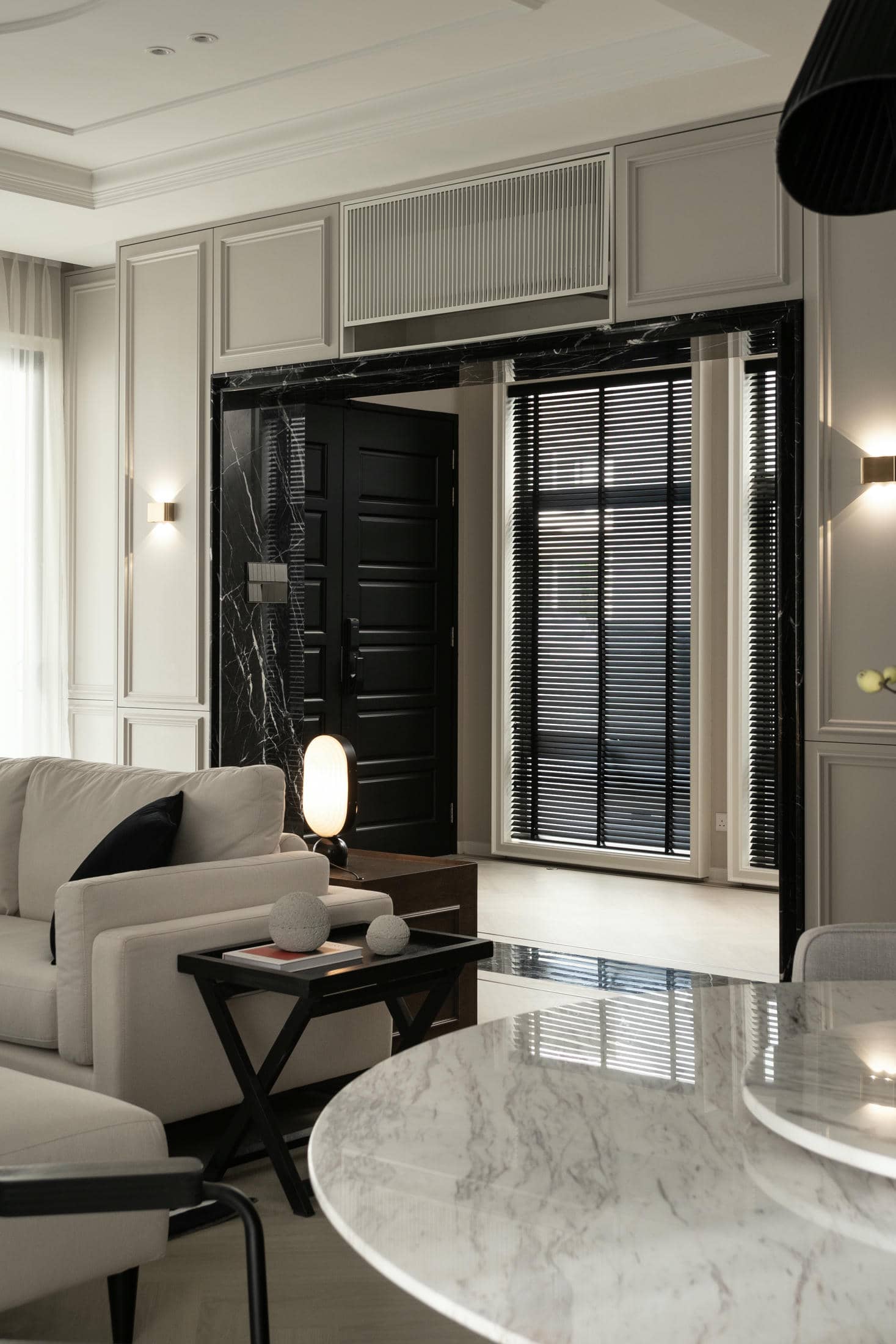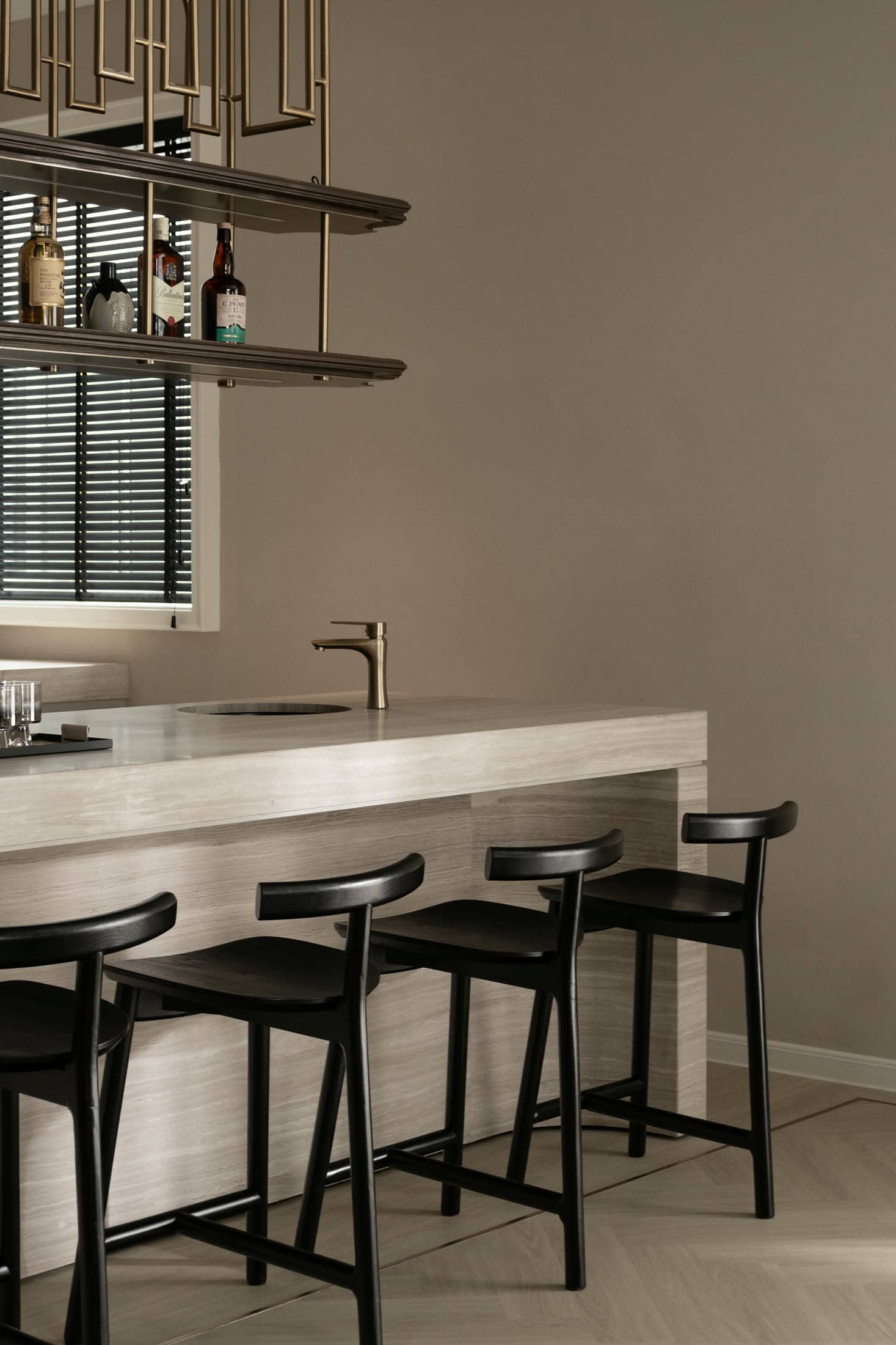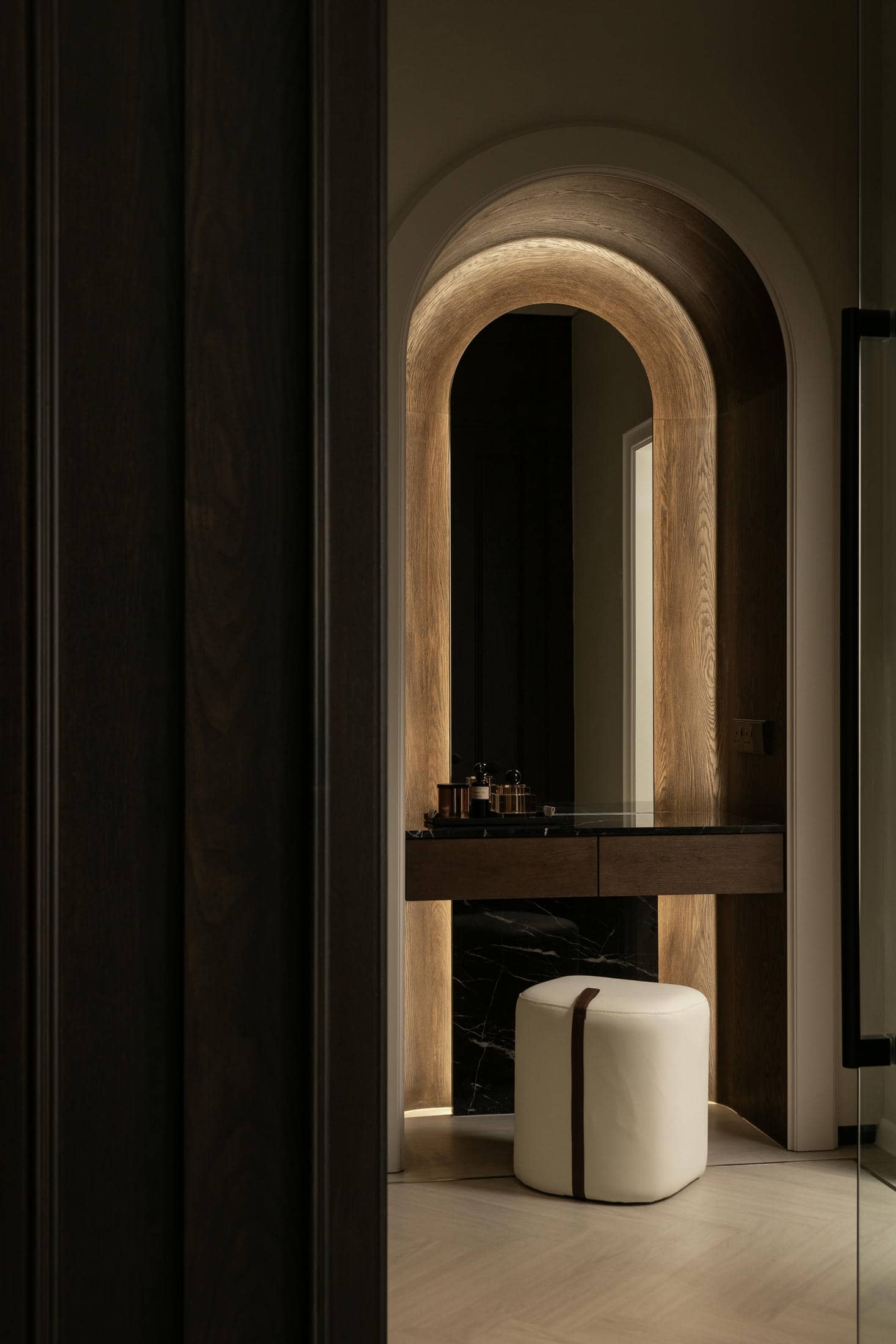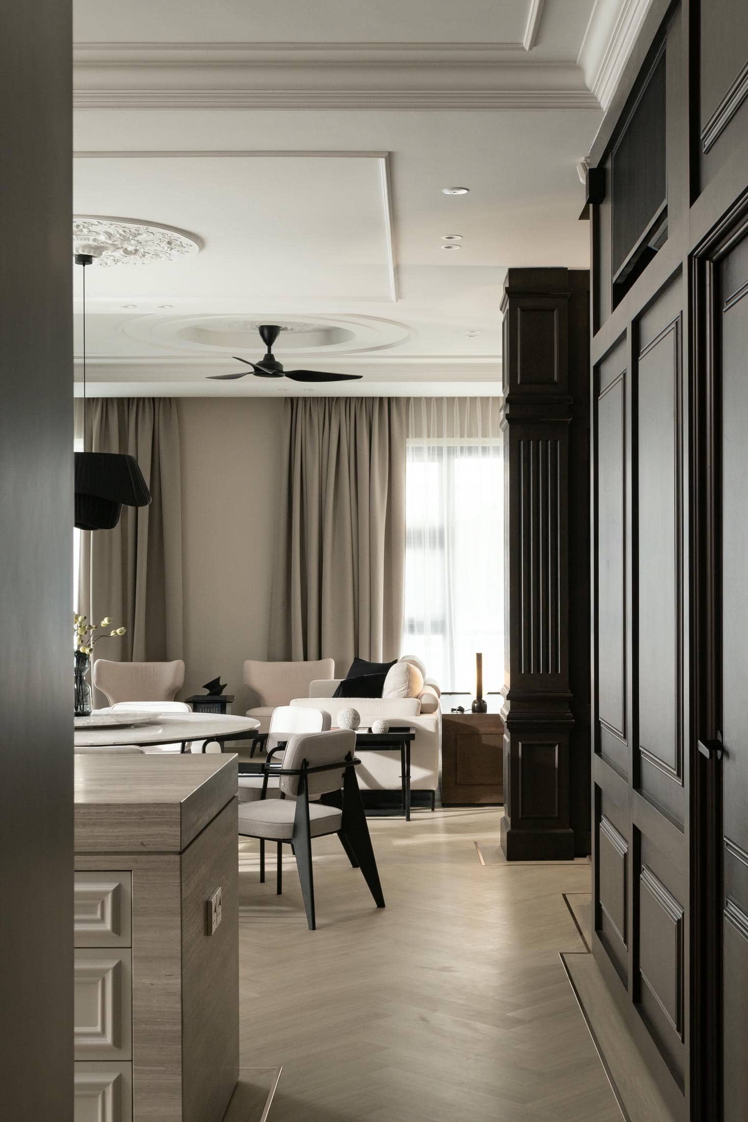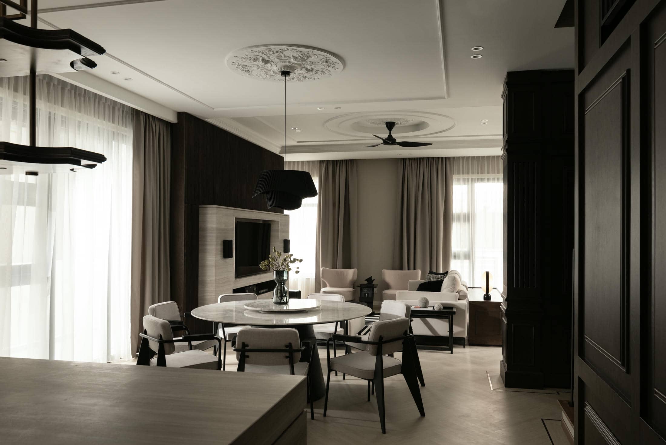 “Time Honoured Modernity” seamlessly merges timeless elegance and luxury with modern simplicity, creating spaces exuding dominance, power, and generational status. It crafts a union between classical beauty and contemporary chic, transforming the entire home into a sanctuary of elevated living. At its core, this signature style blends classical grandeur with sleek modern aesthetics, creating an atmosphere of refined elegance while preserving modern design simplicity. A curated palette of neutral and earthy tones wraps the surroundings, allowing classical and modern elements to coexist harmoniously. Custom and store-bought modern furnishings, such as Nero Black Marble walls and White Calacatta Marble dining tables, infuse opulence into every corner. These choices boast clean lines and minimalist designs, enhancing the play of light throughout the home. The integration of concave designs in elements like the kitchen island, dresser, and ceiling, along with wainscot classic detailing, PVD custom-made stainless-steel racks, ornate moldings, classical columns, arches, and soft, natural textures, introduce depth and visual intrigue without overwhelming the contemporary design. Chaos Design Studio’s philosophy revolves around the artful integration of intricate classical elements, merging classical beauty with modern simplicity. Meticulous craftsmanship and attention to detail cast a spell of dominance, power, and high status throughout the entire home.