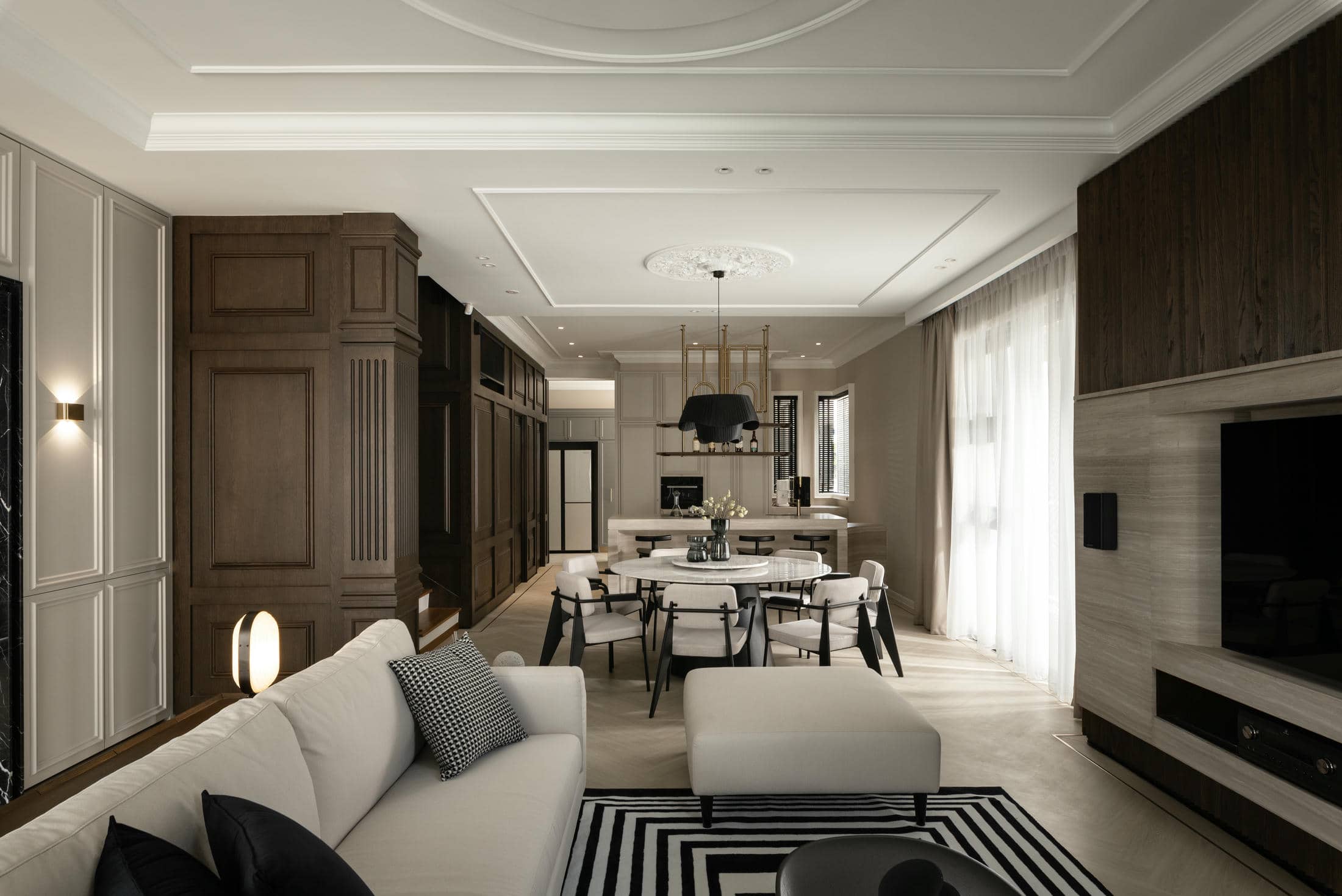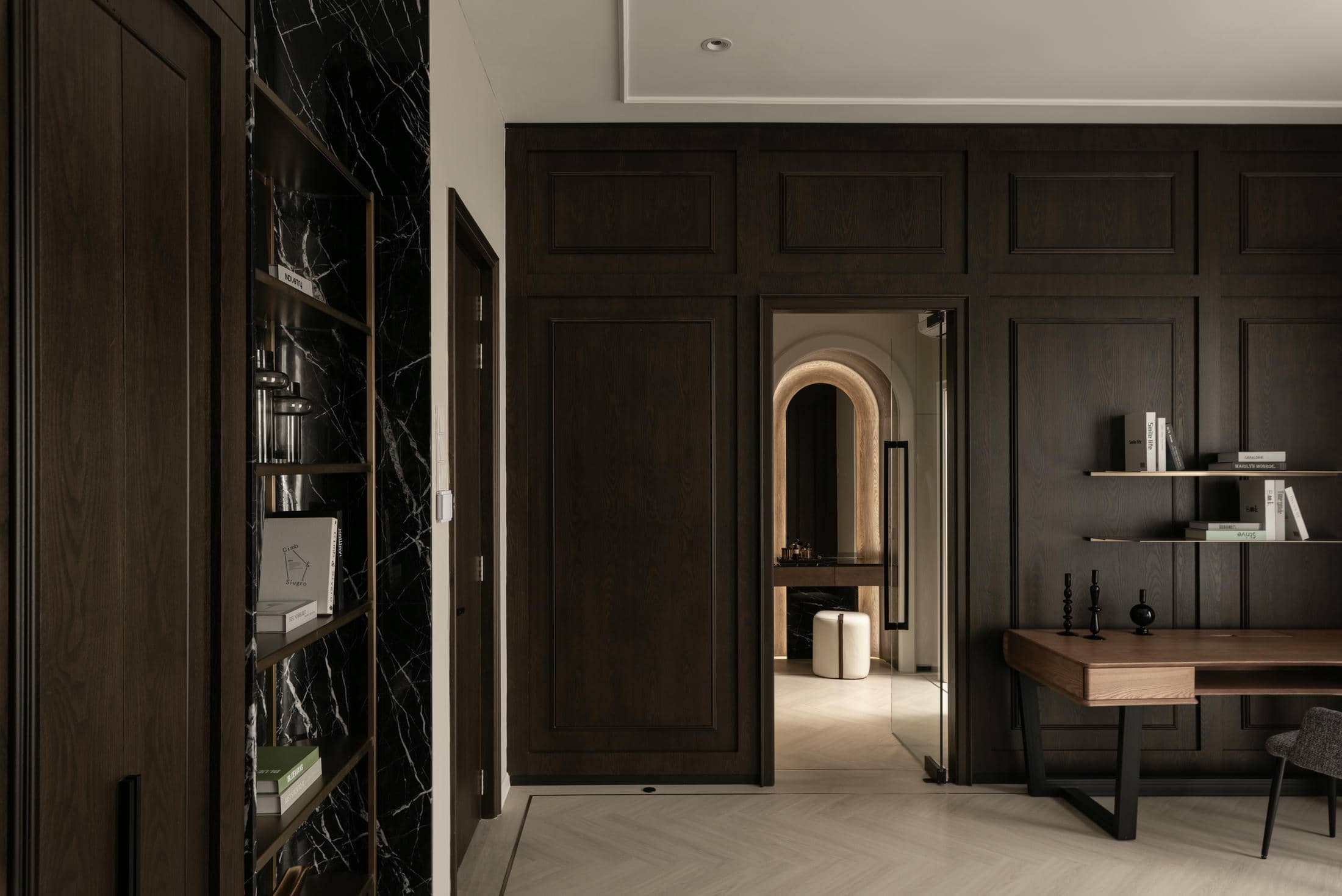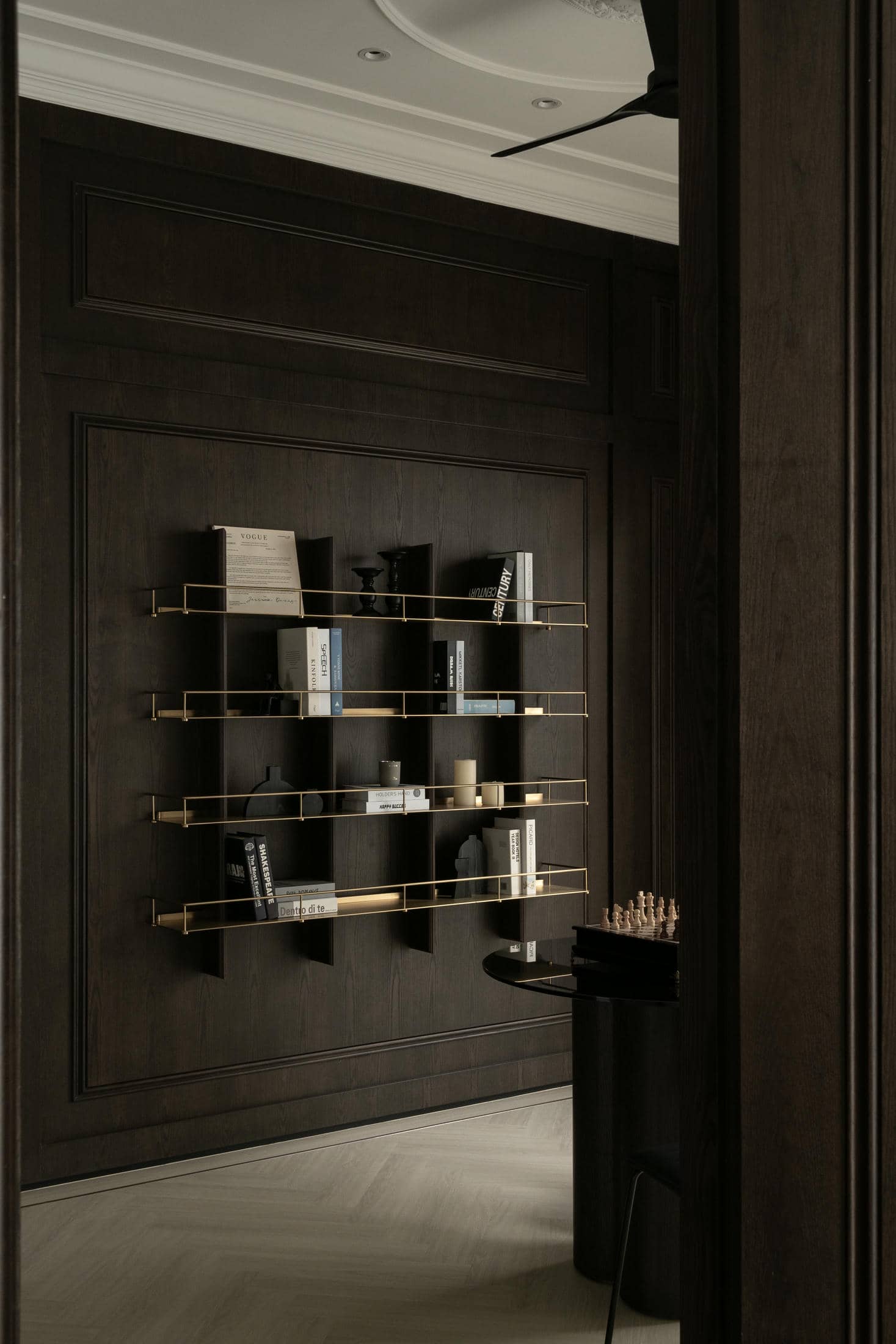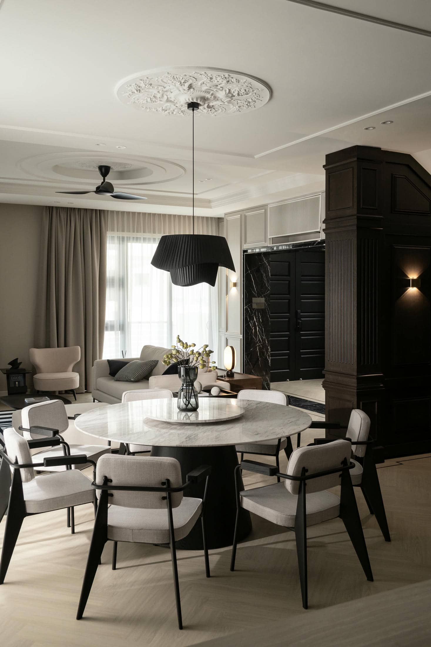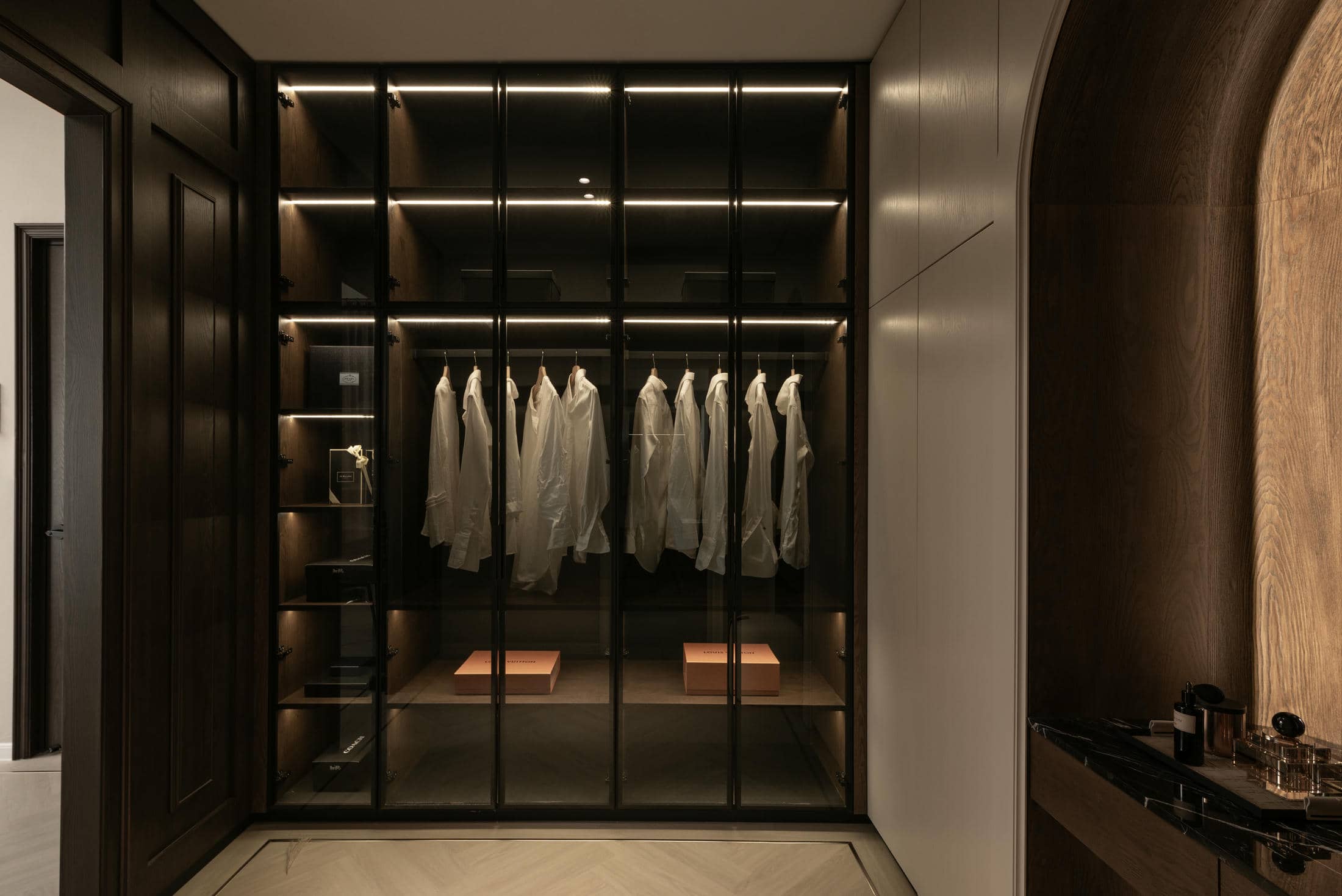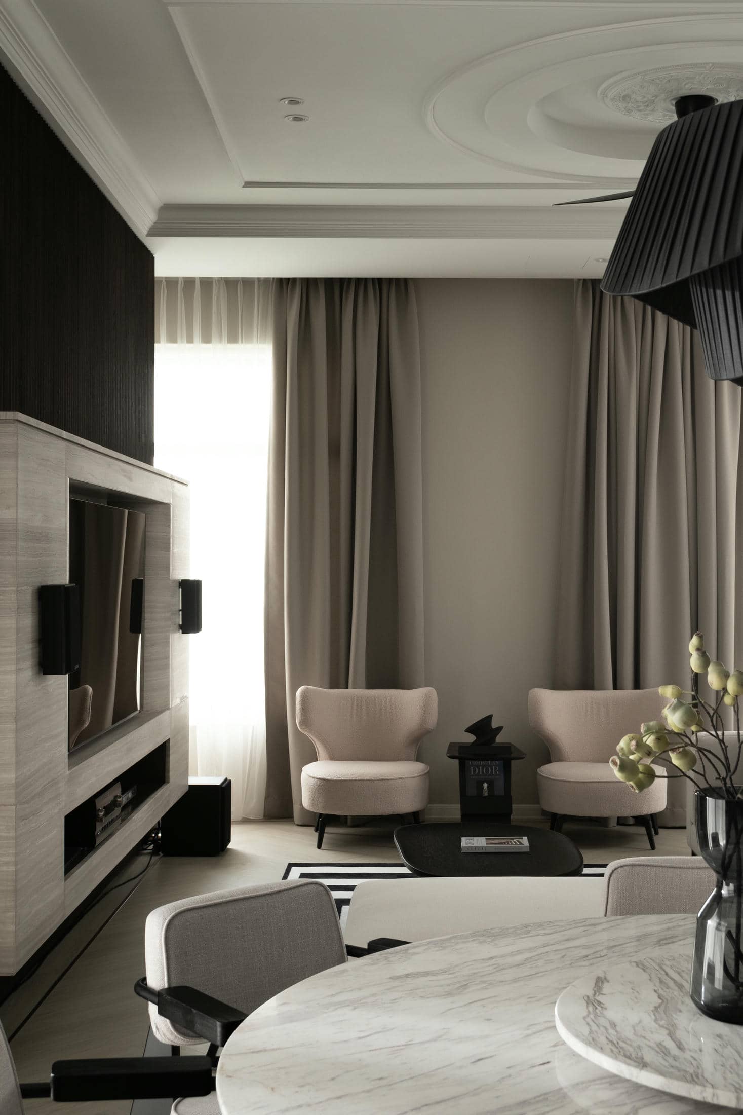 “Time Honoured Modernity” seamlessly merges timeless elegance and luxury with modern simplicity, creating spaces exuding dominance, power, and generational status. It crafts a union between classical beauty and contemporary chic, transforming the entire home into a sanctuary of elevated living. At its core, this signature style blends classical grandeur with sleek modern aesthetics, creating an atmosphere of refined elegance while preserving modern design simplicity. A curated palette of neutral and earthy tones wraps the surroundings, allowing classical and modern elements to coexist harmoniously. Custom and store-bought modern furnishings, such as Nero Black Marble walls and White Calacatta Marble dining tables, infuse opulence into every corner. These choices boast clean lines and minimalist designs, enhancing the play of light throughout the home. The integration of concave designs in elements like the kitchen island, dresser, and ceiling, along with wainscot classic detailing, PVD custom-made stainless-steel racks, ornate moldings, classical columns, arches, and soft, natural textures, introduce depth and visual intrigue without overwhelming the contemporary design. Chaos Design Studio’s philosophy revolves around the artful integration of intricate classical elements, merging classical beauty with modern simplicity. Meticulous craftsmanship and attention to detail cast a spell of dominance, power, and high status throughout the entire home.