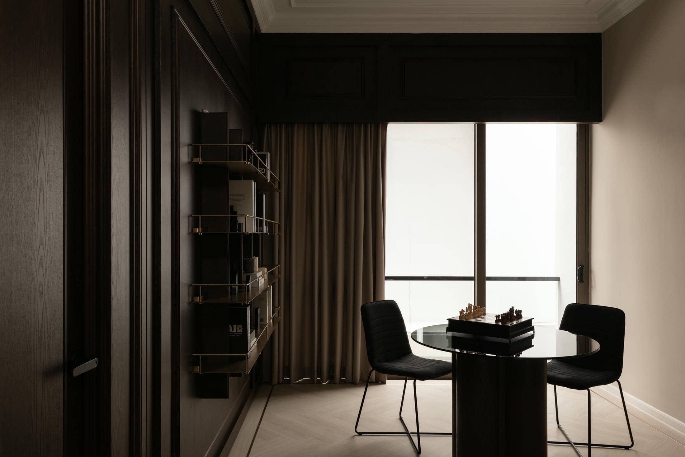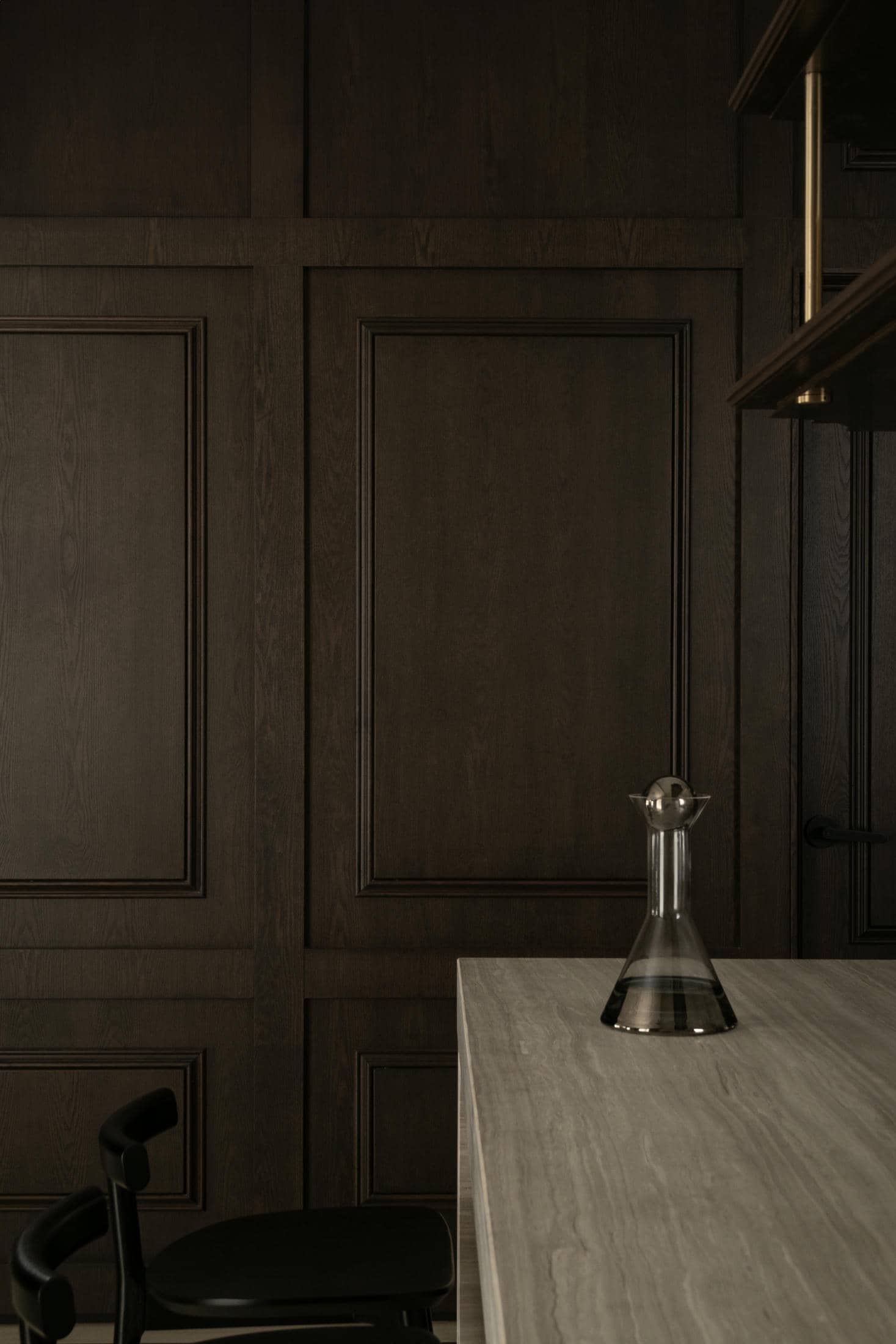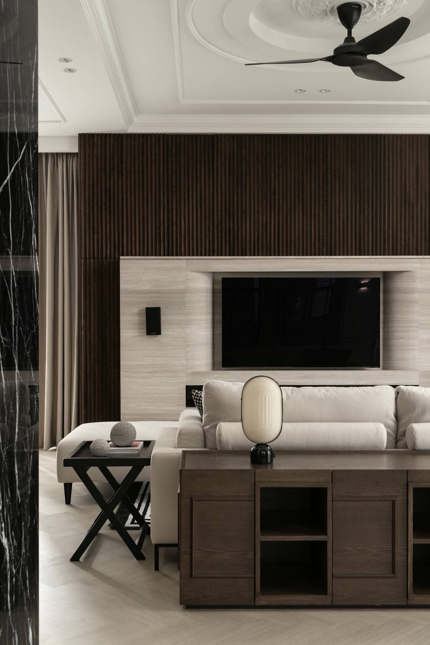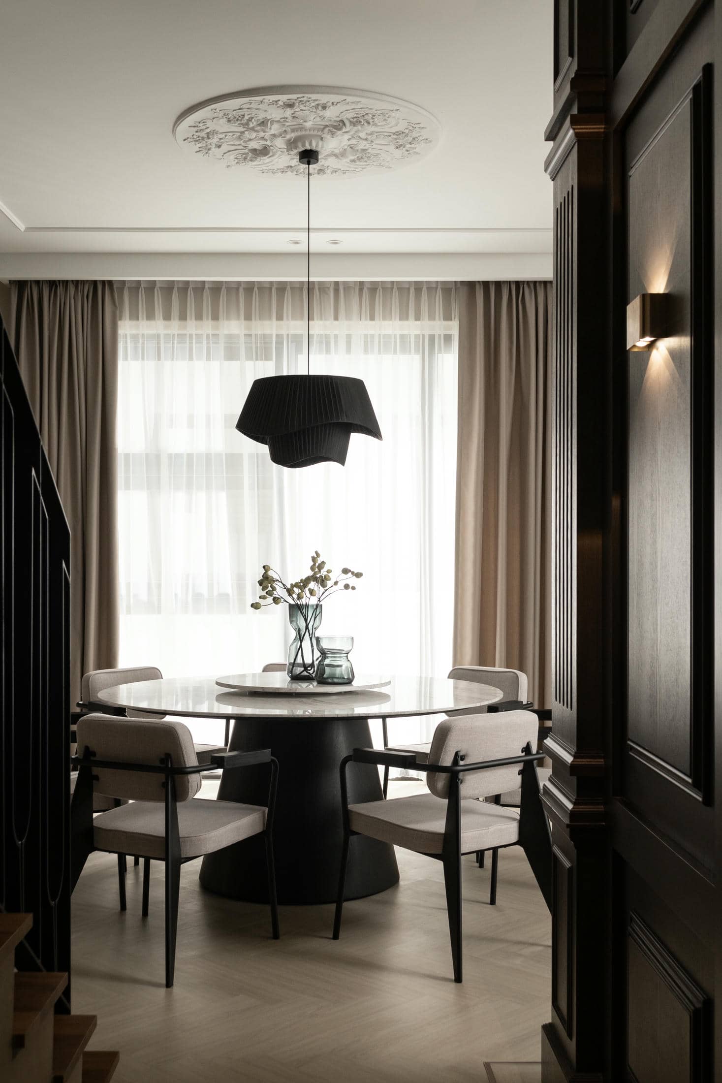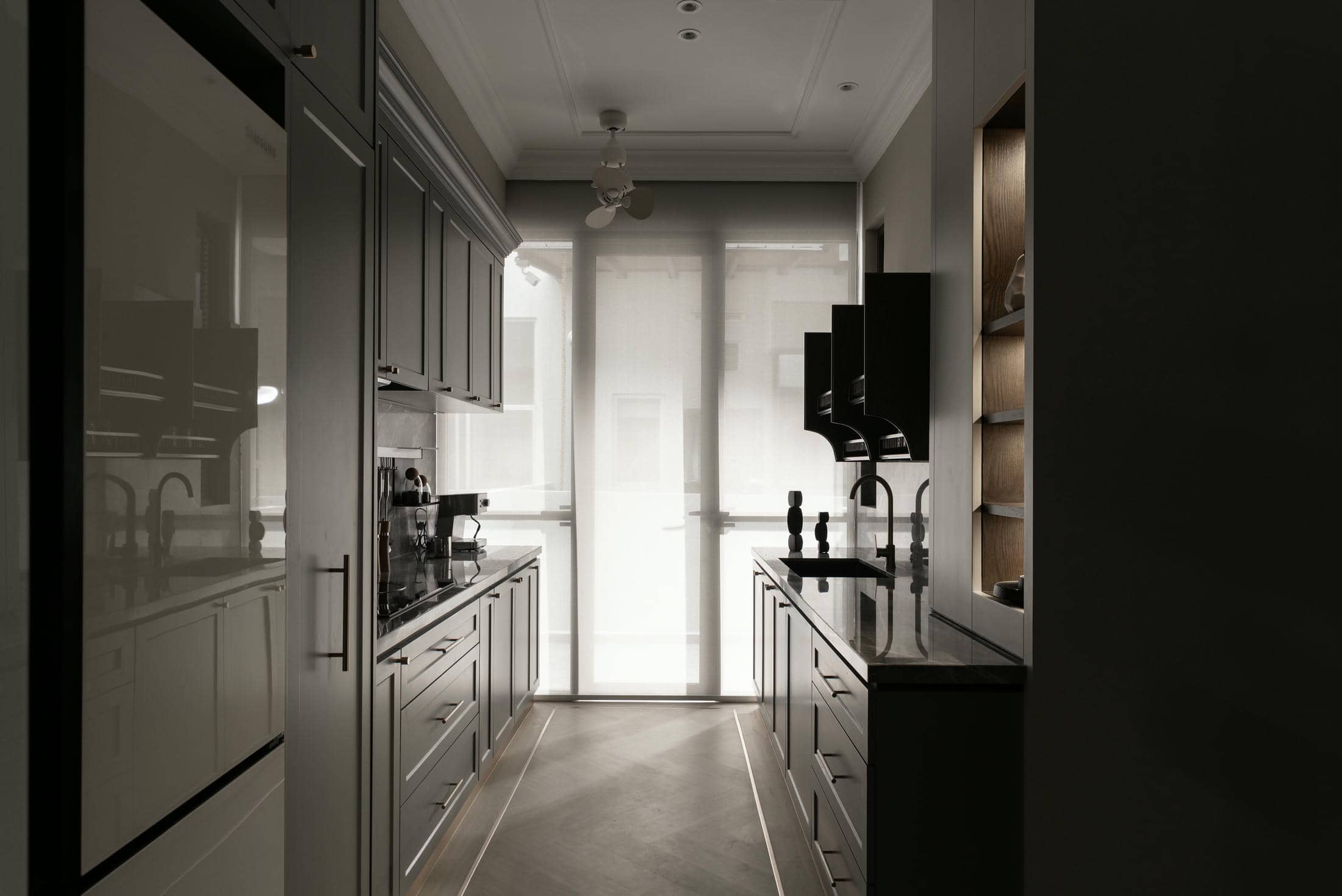 “Time Honoured Modernity” seamlessly merges timeless elegance and luxury with modern simplicity, creating spaces exuding dominance, power, and generational status. It crafts a union between classical beauty and contemporary chic, transforming the entire home into a sanctuary of elevated living. At its core, this signature style blends classical grandeur with sleek modern aesthetics, creating an atmosphere of refined elegance while preserving modern design simplicity. A curated palette of neutral and earthy tones wraps the surroundings, allowing classical and modern elements to coexist harmoniously. Custom and store-bought modern furnishings, such as Nero Black Marble walls and White Calacatta Marble dining tables, infuse opulence into every corner. These choices boast clean lines and minimalist designs, enhancing the play of light throughout the home. The integration of concave designs in elements like the kitchen island, dresser, and ceiling, along with wainscot classic detailing, PVD custom-made stainless-steel racks, ornate moldings, classical columns, arches, and soft, natural textures, introduce depth and visual intrigue without overwhelming the contemporary design. Chaos Design Studio’s philosophy revolves around the artful integration of intricate classical elements, merging classical beauty with modern simplicity. Meticulous craftsmanship and attention to detail cast a spell of dominance, power, and high status throughout the entire home.