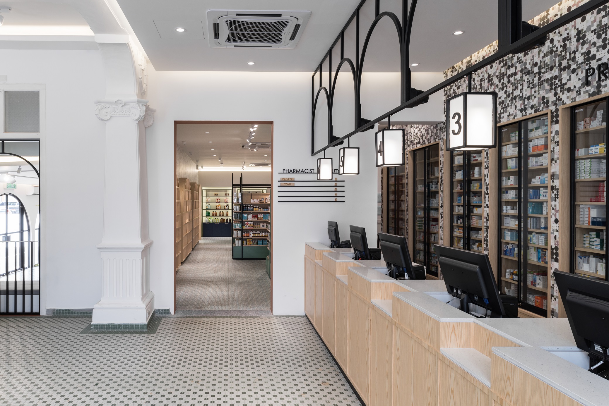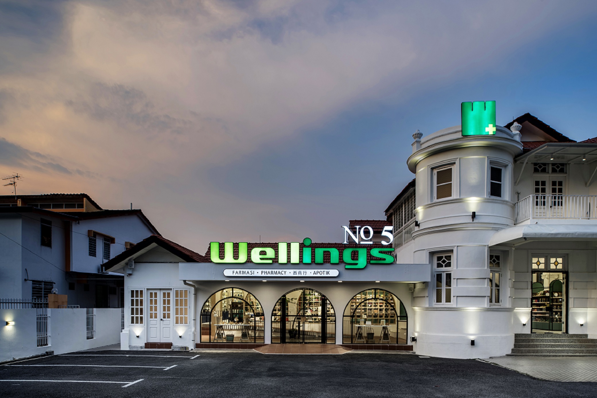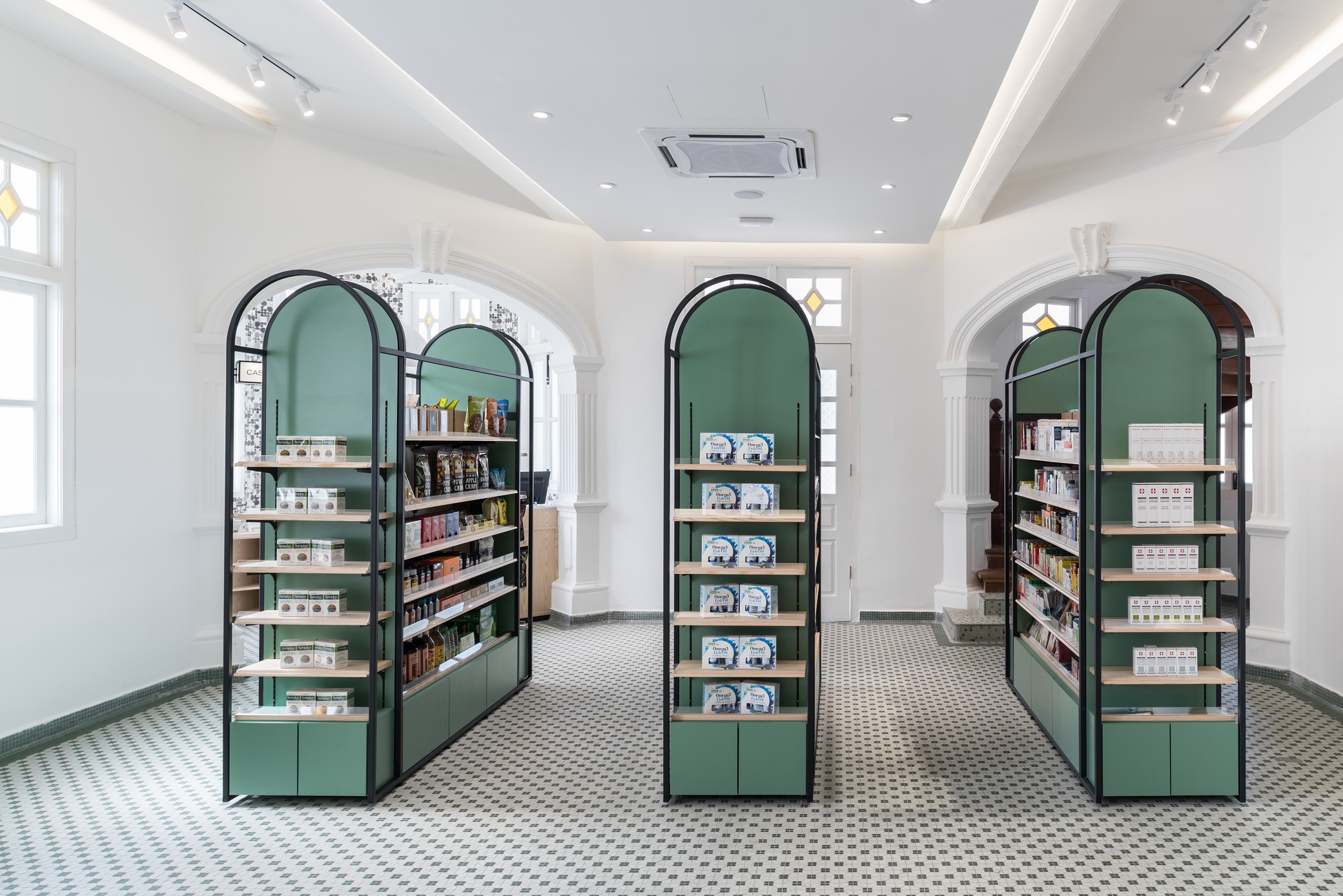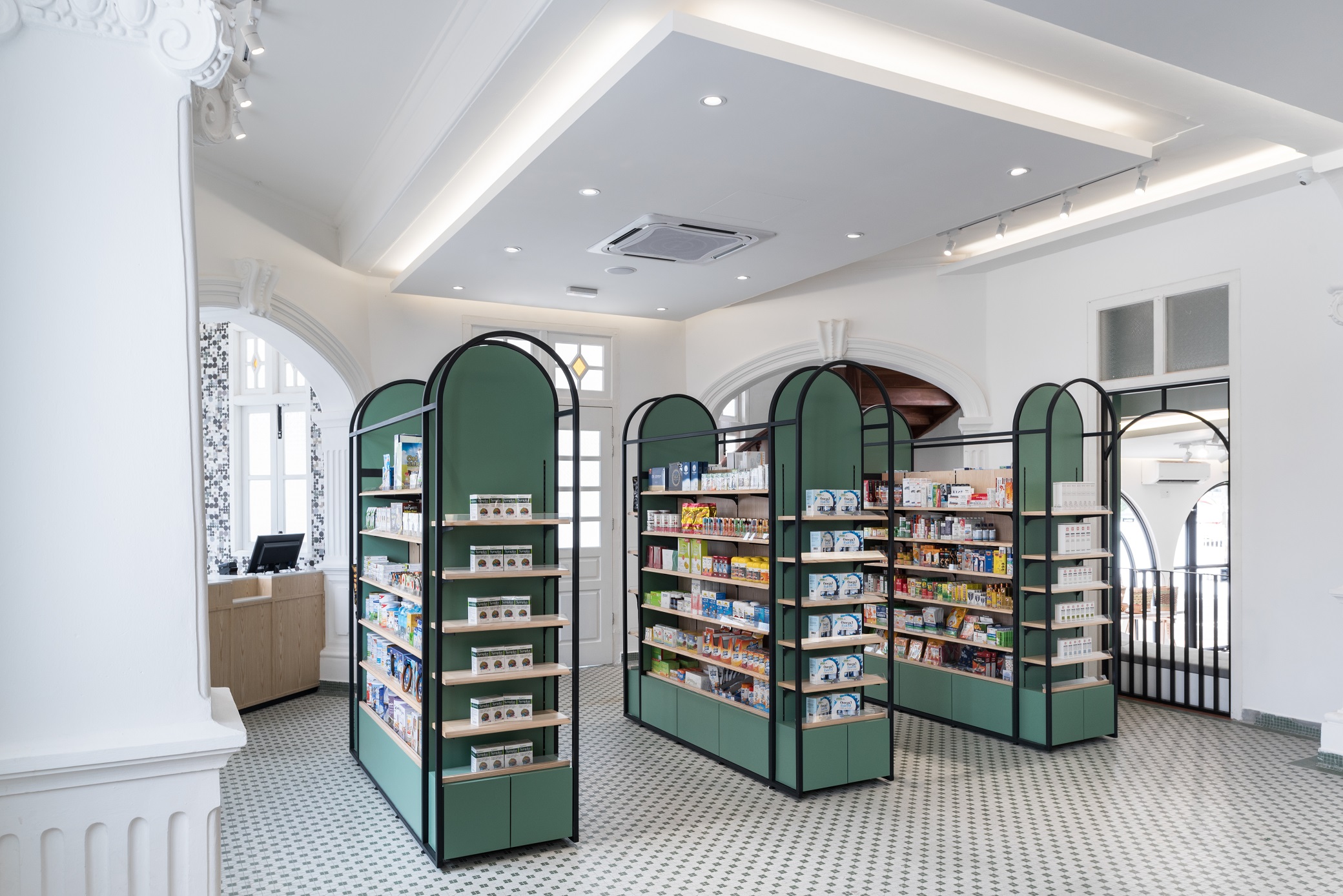 Wellings Pharmacy is a trusted name in the pharmaceutical industry and medical tourism with the dual aim of serving the wellness needs of the people and utilizing holistic applications to encourage the adoption of healthier lifestyles. On Penang island itself, Wellings Pharmacy has quite a number of branches scattered around the town area, one of which is named Wellings No.5. Gazetted as a heritage mansion, the existing empty building comes with distinctive colonial architecture with arched elements and exquisite cornices. By building on and re-using these elements in the design, we derived on a unique concept that is a blend of rich heritage and modern vibes. In breaking the stereotype that pharmacies are dull and monotonous, Wellings No.5 houses several divisions, seeking to provide an opportunity for creative individuals and start-ups to have an actual merchandising spot and to be able to, in their individual specialty, provide a sense of healing for all visiting consumers.