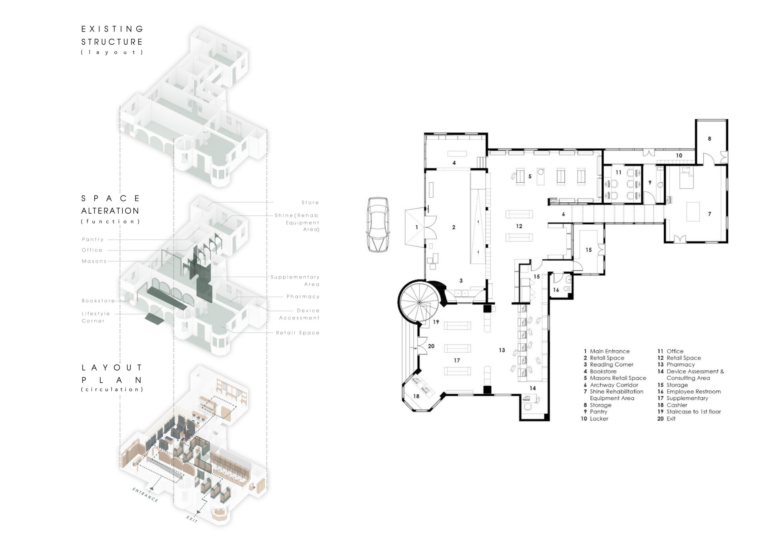 While designing the layout, several considerations were taken into account when converting the existing residential mansion’s functions for commercial use. A more open and permeable design was proposed by removing the existing partitions using methods that suit the structure of the building, creating a good one-way flow from the main entrance to each section is important to direct an efficient flow of traffic in and out of the store. Since the space houses different functions, an open layout with clear definition of various spatial functions would be most ideal for this project. We made use of the existing scattered layout, but opened up the existing rooms and grouped certain spaces together for a sense of segregation as well as accessibility and interaction between the different spatial functions.