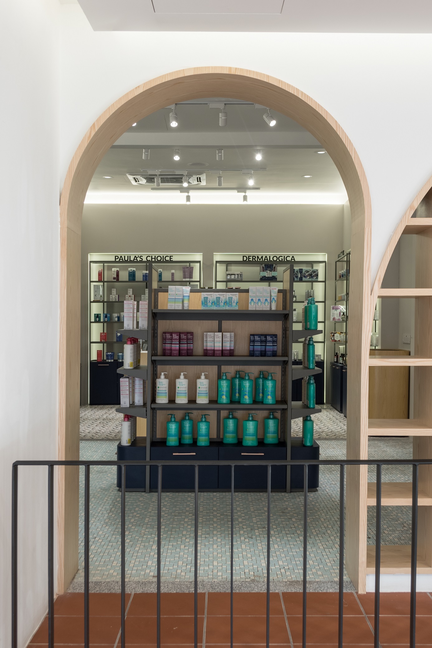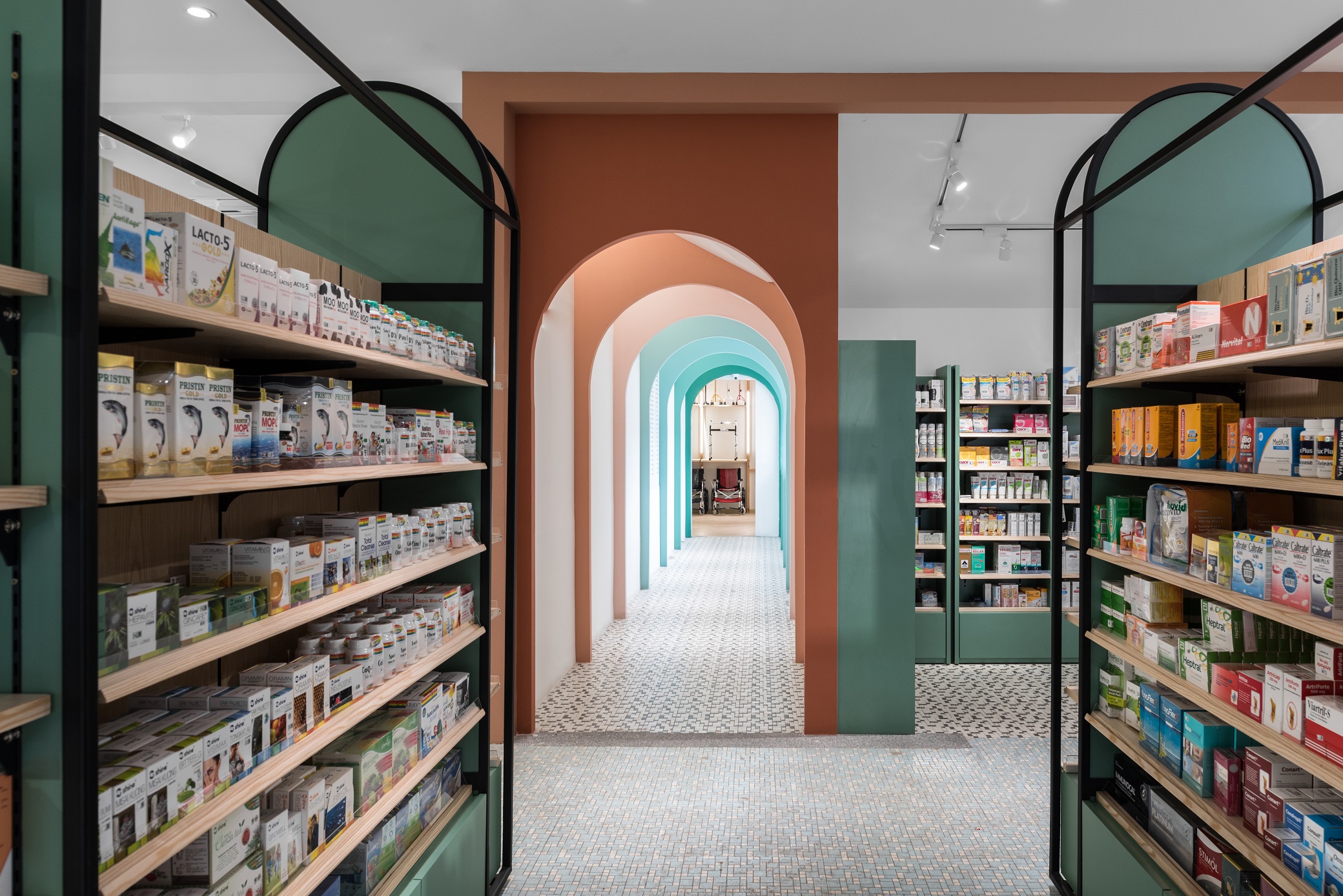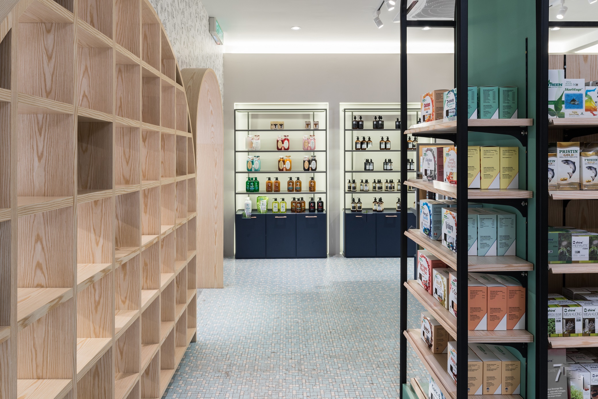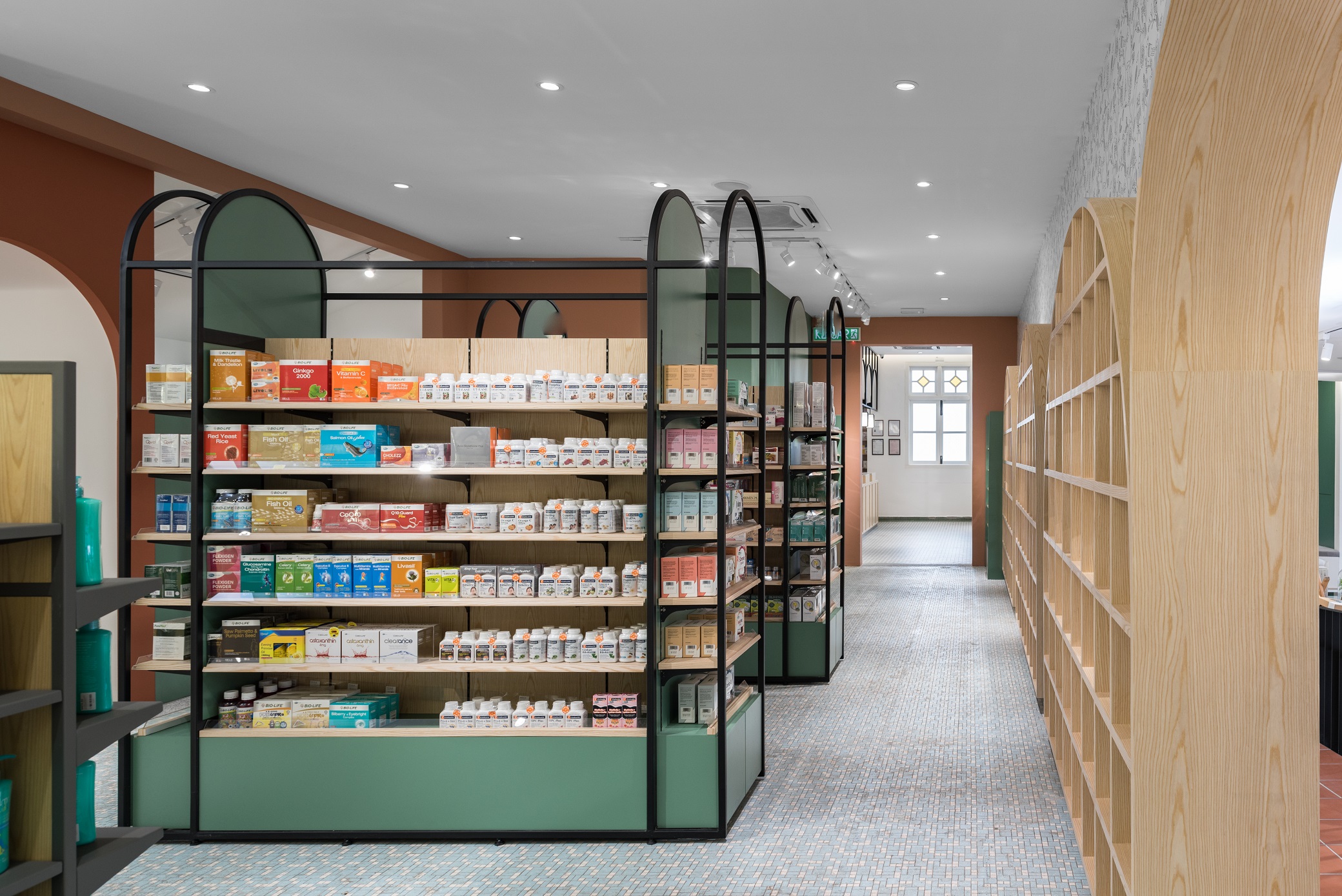To express the organicity and nature of its business, indoor greenery and a brighter shade in combination with wooden elements and Terracota flooring to convey a cheerful welcome to visitors. Arched elements, counter décor and shelves are designed to reflect elegance and luxury, while heritage materials and styles are maintained from the existing design – to showcase the local culture with a touch of modern vibrancy. Chequered shelves that follow the ergonomic curve of the archways double as a feature wall/semi-screen and compartments for product and promotional displays. The book store features a variety of health and wellness related books, displayed on a long glass table and several smaller wooden tables. A ramp, which provides easier access to disabled/wheelchair bound visitors, leads visitors to the pharmacy, which is designed with navy blue display cabinets to complement its blue mosaic flooring. A long hallway connects the pharmacy to the area for disability aids, while at the same time, offers nice external views while traversing from one space to another. Here, a custom made floor-to-ceiling display rack is built for wheelchairs, walking sticks and miscellaneous items