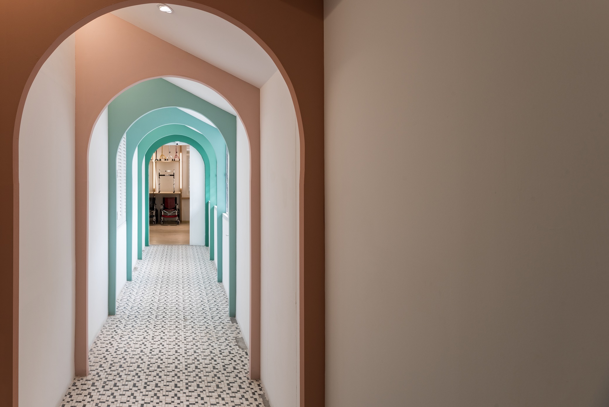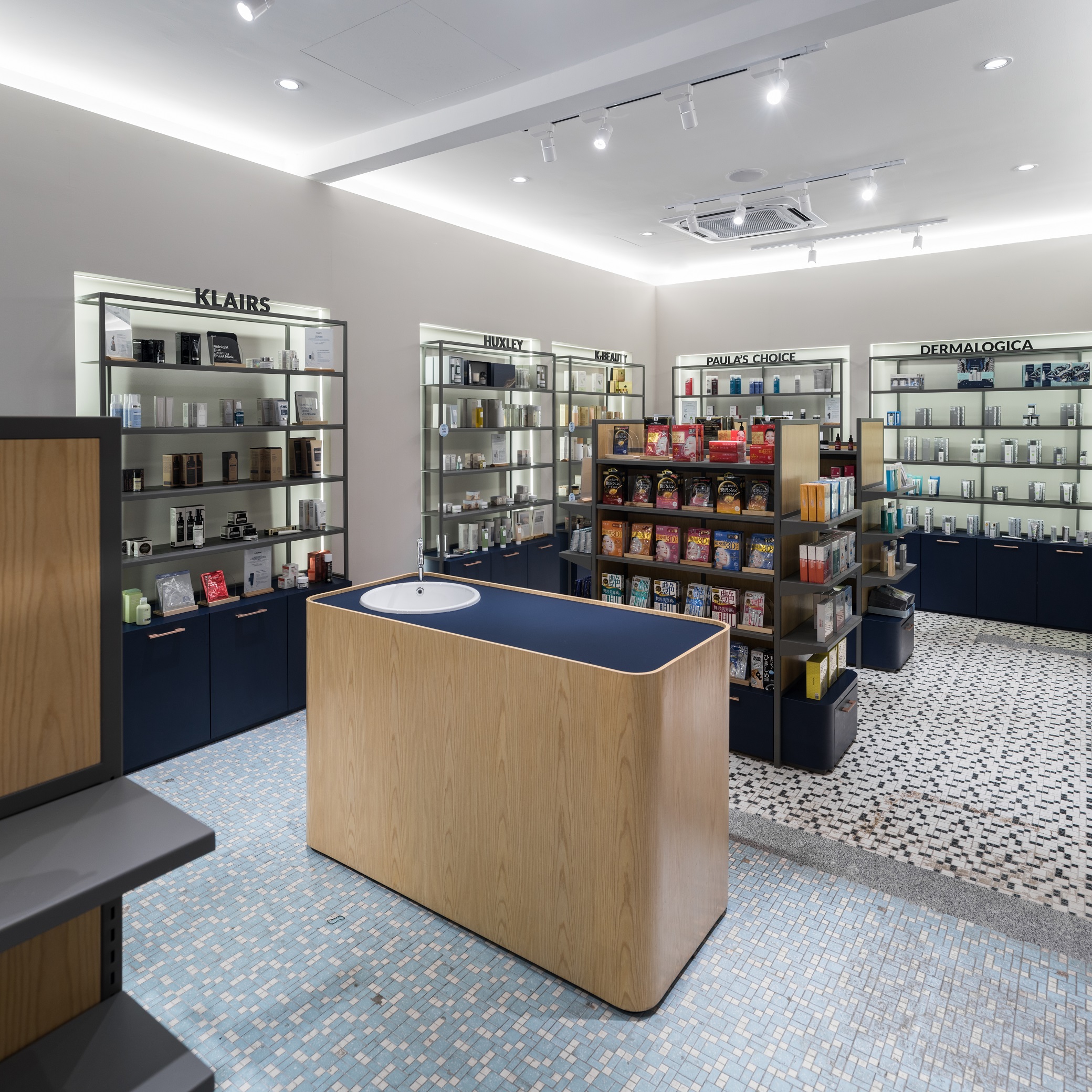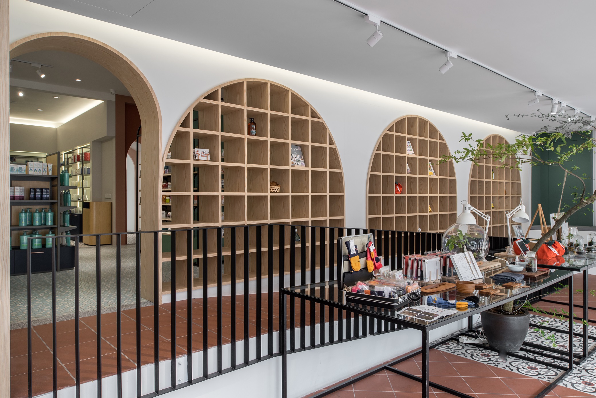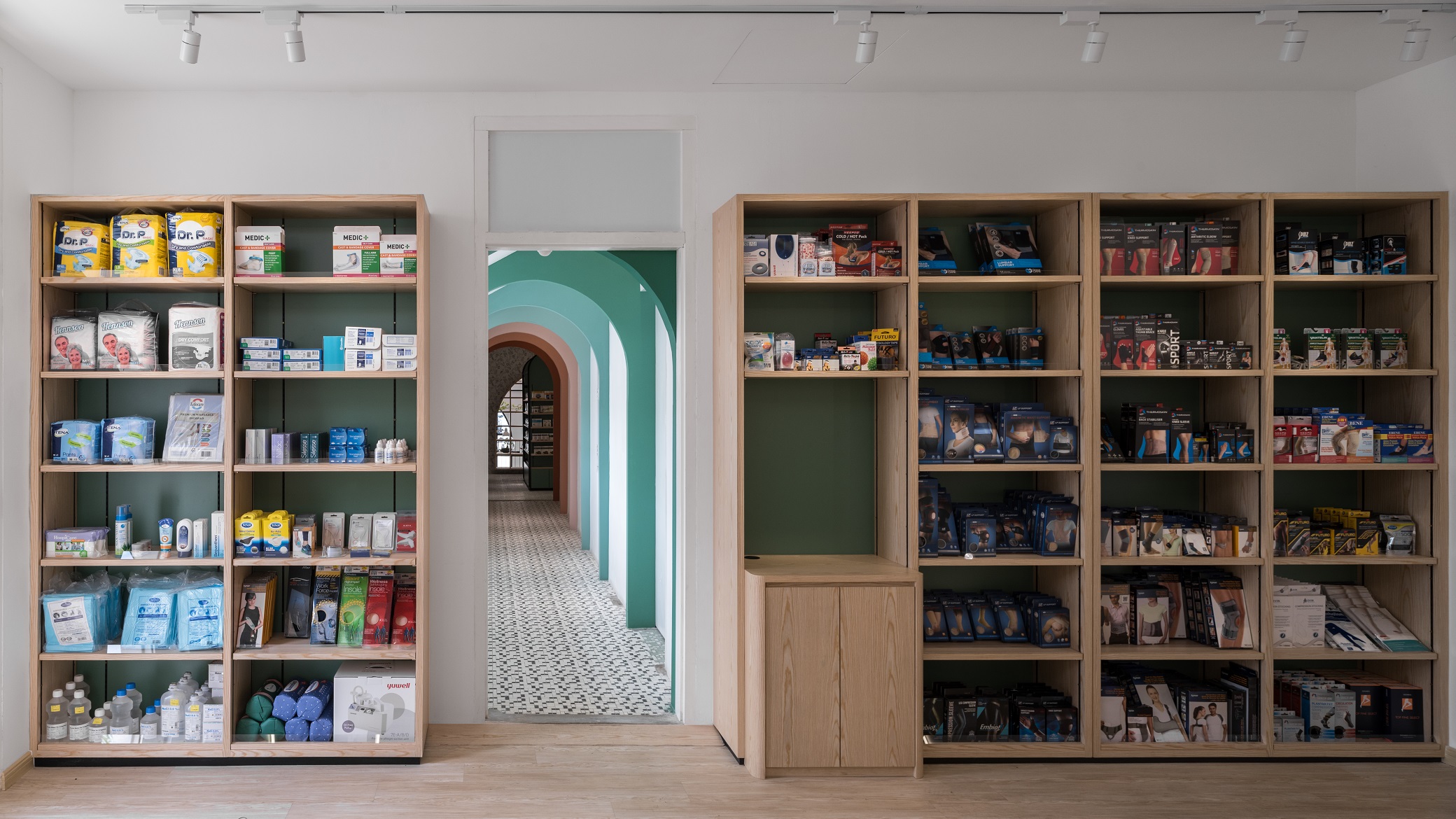 To express the organicity and nature of its business, indoor greenery and a brighter shade in combination with wooden elements and Terracota flooring to convey a cheerful welcome to visitors. Arched elements, counter décor and shelves are designed to reflect elegance and luxury, while heritage materials and styles are maintained from the existing design – to showcase the local culture with a touch of modern vibrancy. Chequered shelves that follow the ergonomic curve of the archways double as a feature wall/semi-screen and compartments for product and promotional displays. The book store features a variety of health and wellness related books, displayed on a long glass table and several smaller wooden tables. A ramp, which provides easier access to disabled/wheelchair bound visitors, leads visitors to the pharmacy, which is designed with navy blue display cabinets to complement its blue mosaic flooring. A long hallway connects the pharmacy to the area for disability aids, while at the same time, offers nice external views while traversing from one space to another. Here, a custom made floor-to-ceiling display rack is built for wheelchairs, walking sticks and miscellaneous items