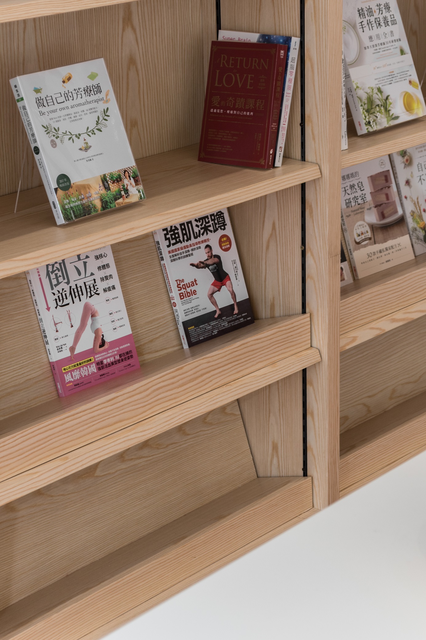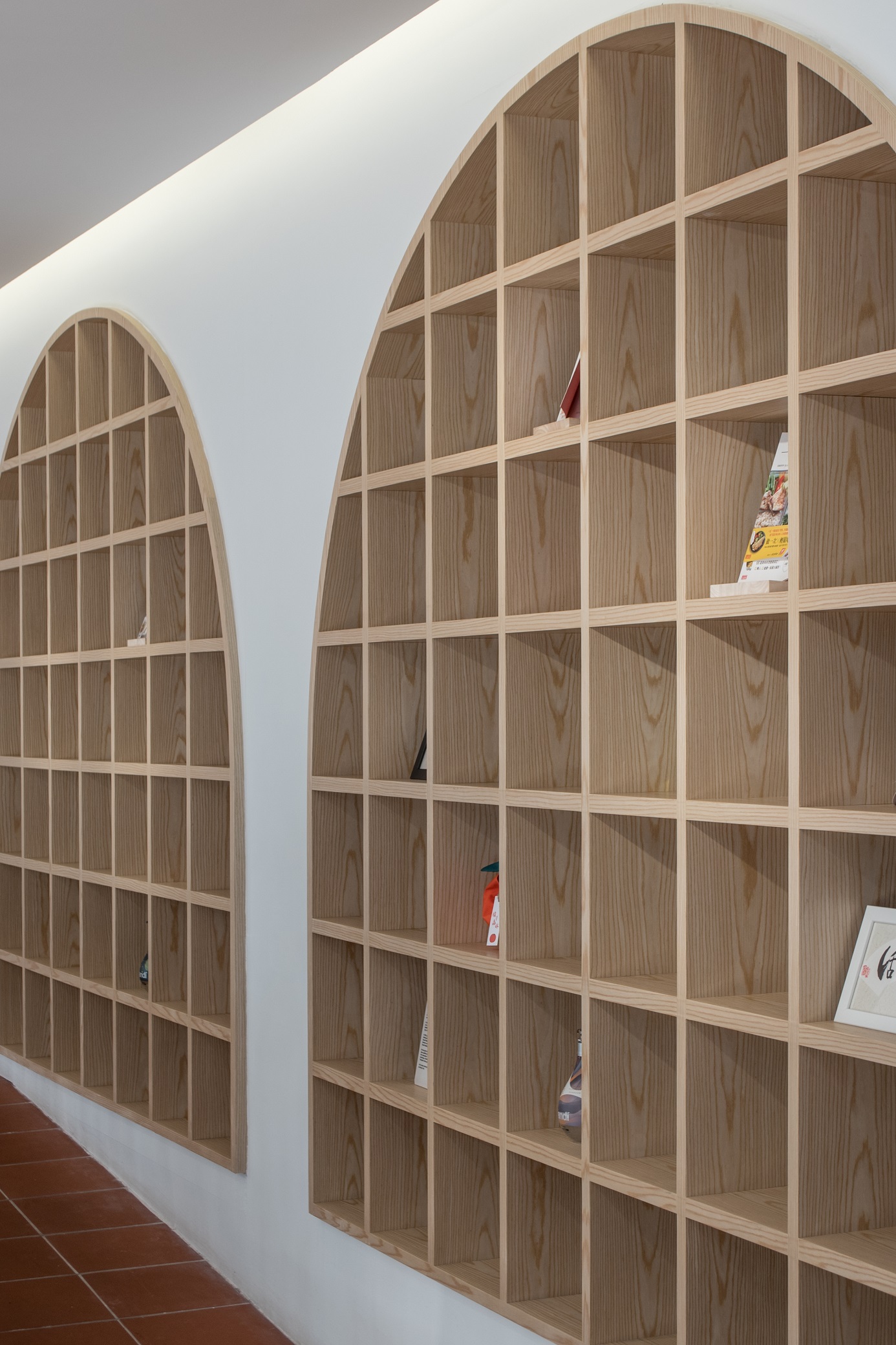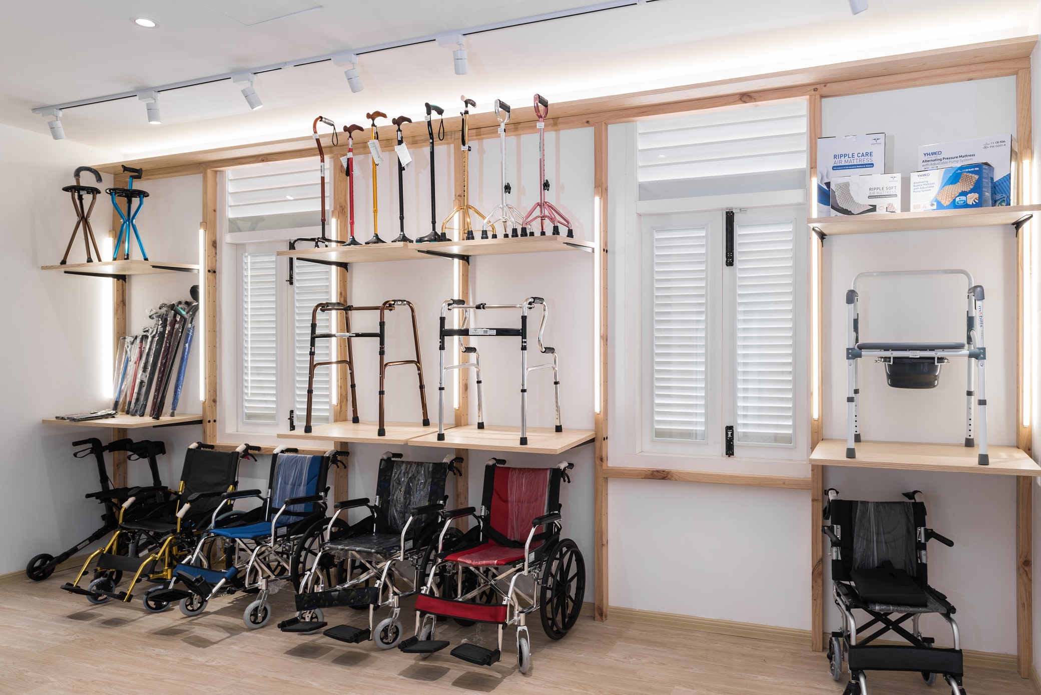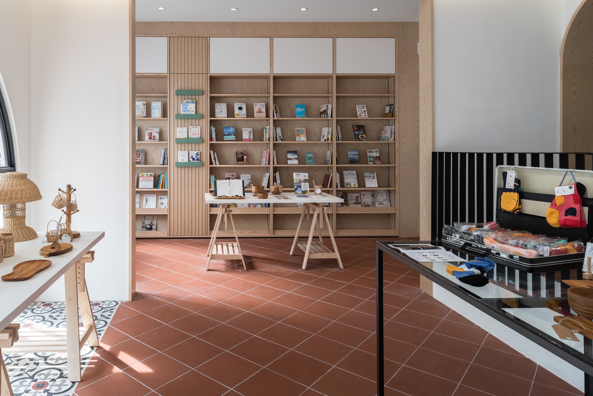 To express the organicity and nature of its business, indoor greenery and a brighter shade in combination with wooden elements and Terracota flooring to convey a cheerful welcome to visitors. Arched elements, counter décor and shelves are designed to reflect elegance and luxury, while heritage materials and styles are maintained from the existing design – to showcase the local culture with a touch of modern vibrancy. Chequered shelves that follow the ergonomic curve of the archways double as a feature wall/semi-screen and compartments for product and promotional displays. The book store features a variety of health and wellness related books, displayed on a long glass table and several smaller wooden tables. A ramp, which provides easier access to disabled/wheelchair bound visitors, leads visitors to the pharmacy, which is designed with navy blue display cabinets to complement its blue mosaic flooring. A long hallway connects the pharmacy to the area for disability aids, while at the same time, offers nice external views while traversing from one space to another. Here, a custom made floor-to-ceiling display rack is built for wheelchairs, walking sticks and miscellaneous items
